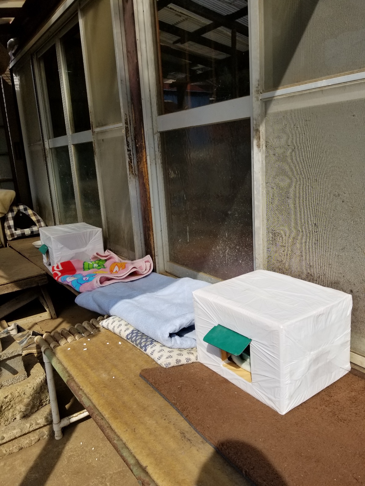 手術を済ませて一代限りとなった子たちは、湯たんぽを入れてくれた猫ハウスで夜間も温かく過ごしているそうです。