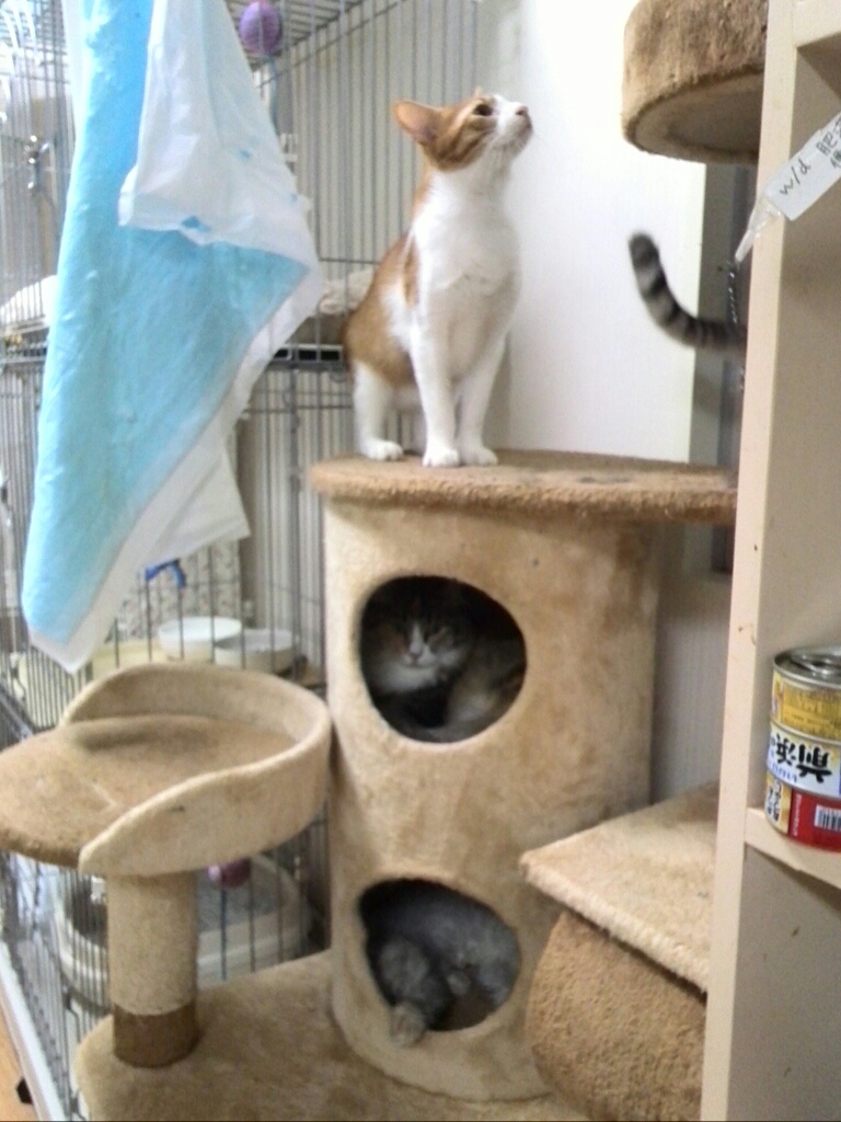 エサやりさんの所の6匹は皆避妊去勢を済ませてケージから解放し作業場と事務所内を好きに出入りしています。