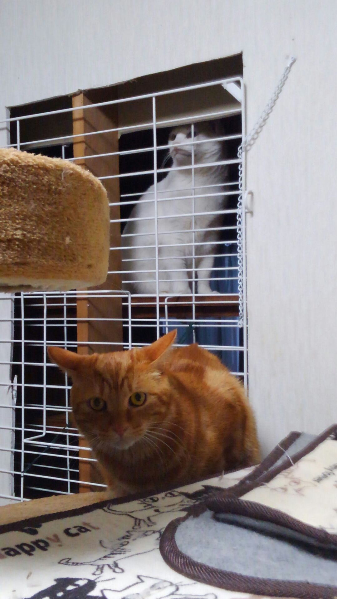ゲージを覆っていた布を外して同室の四匹とさりげなく互いの存在をわかるようにしました。