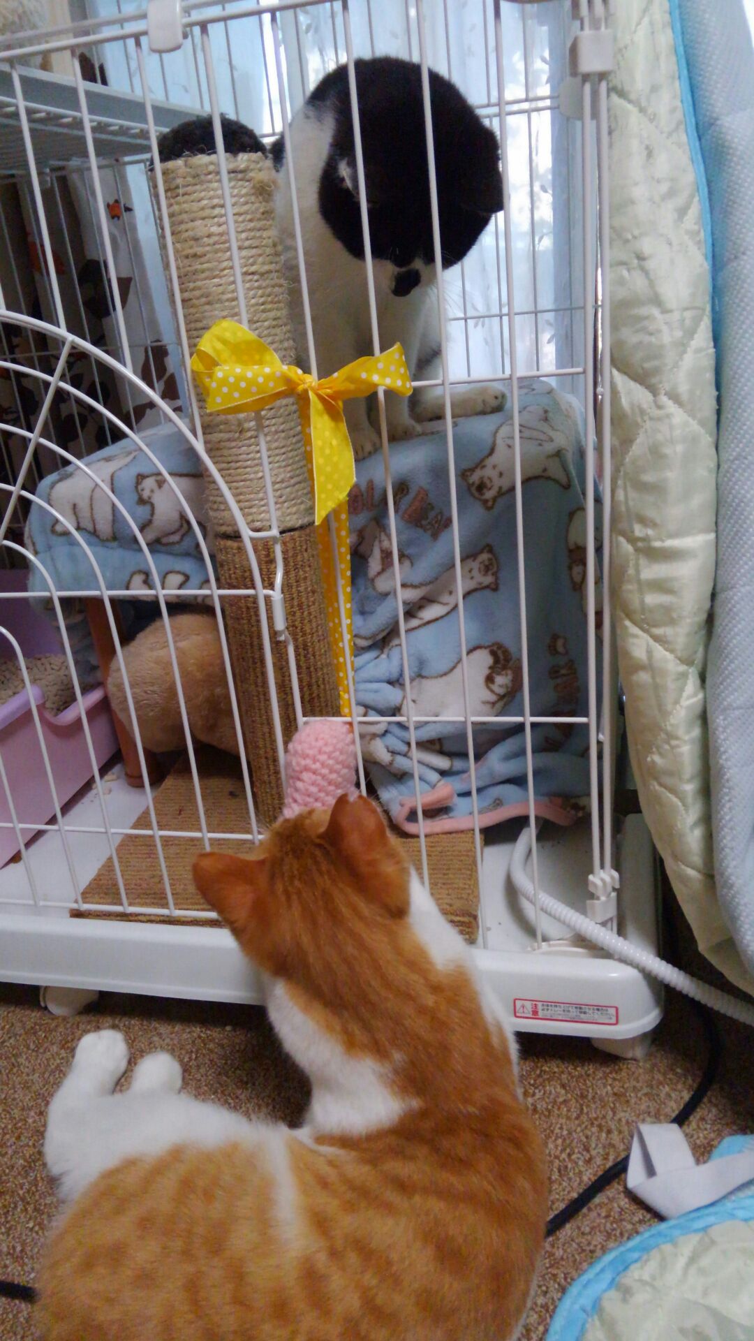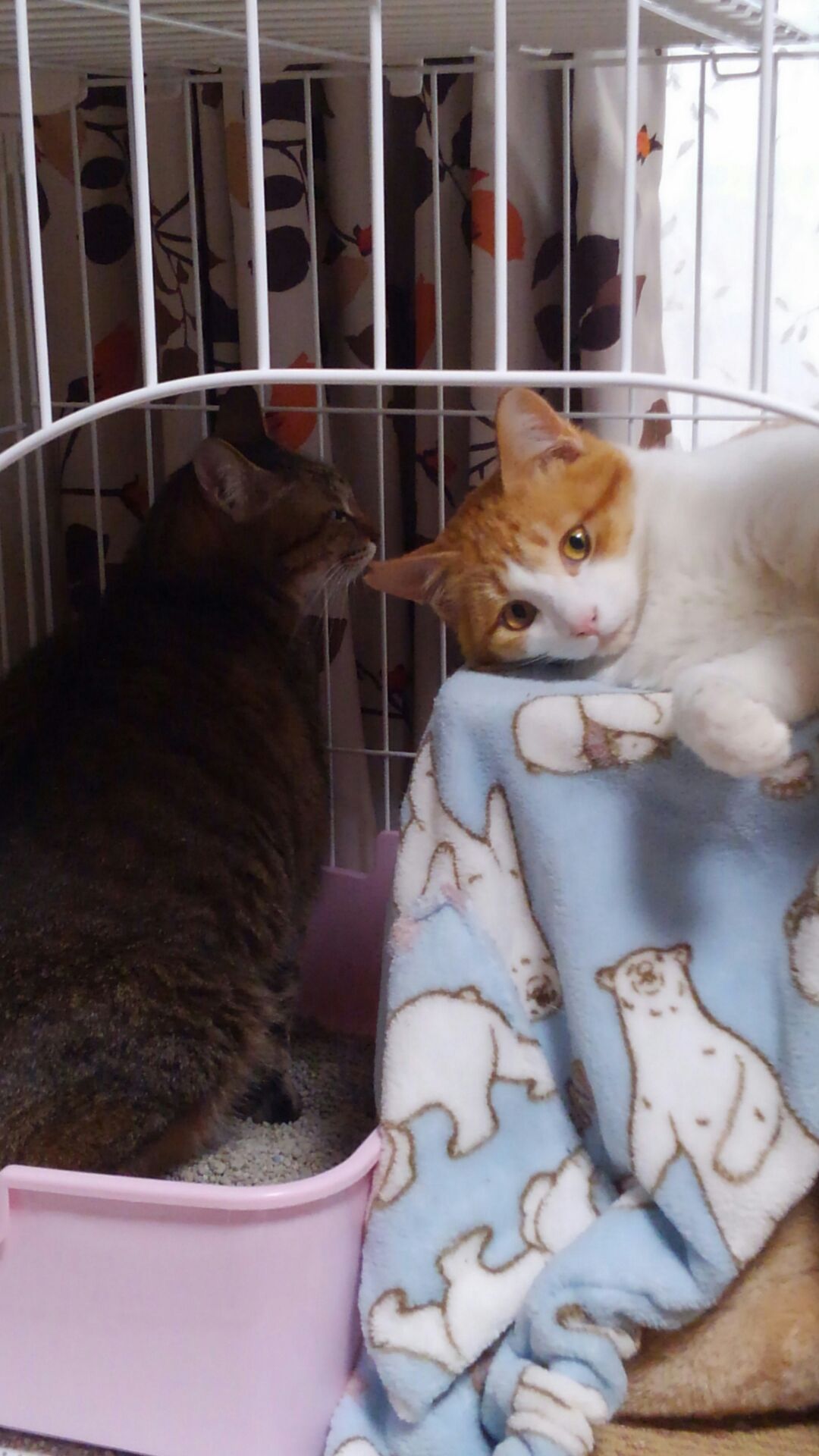 でもゲージ暮らしは初めてで、覗きに来る琥珀にも辟易しています。