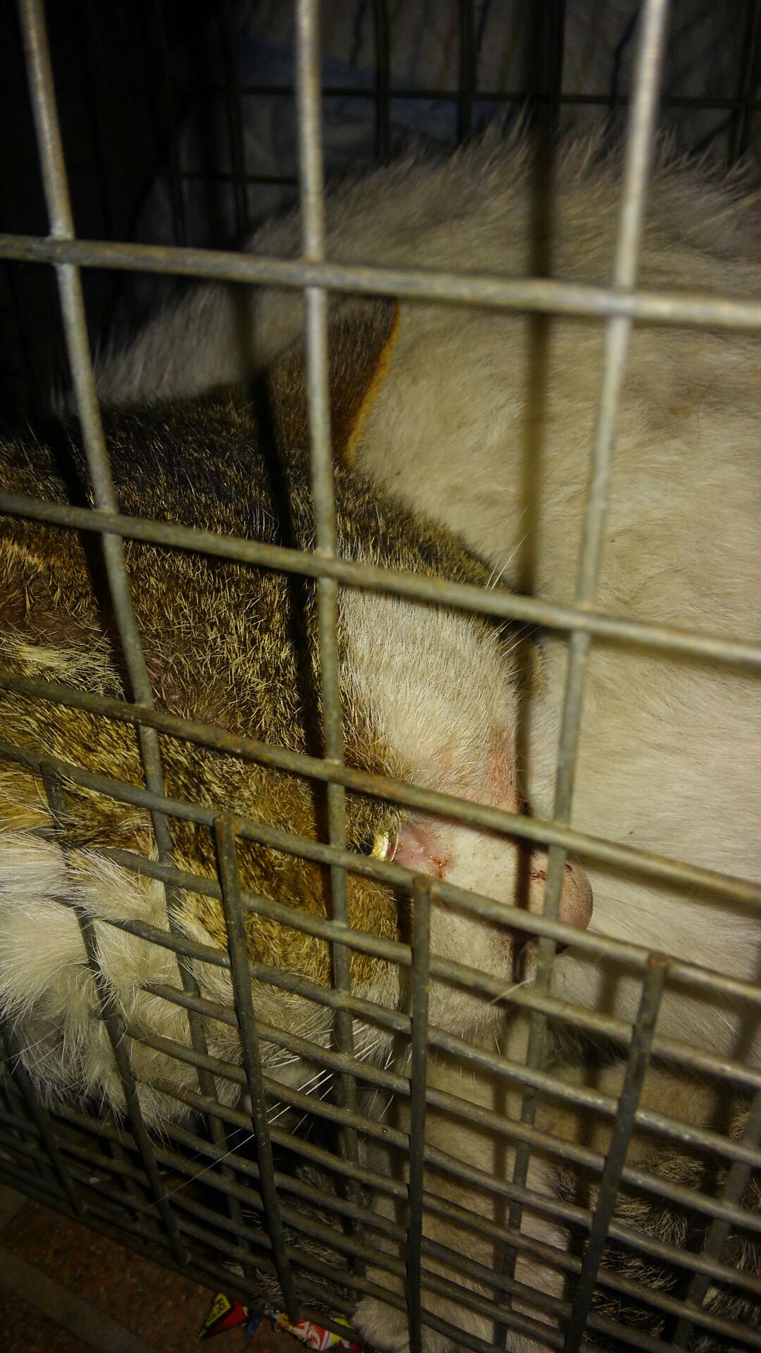 暴れて顔がすりむけています。