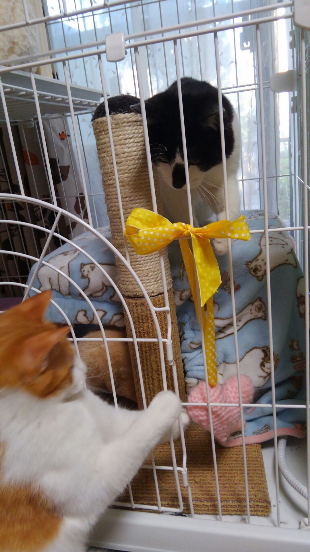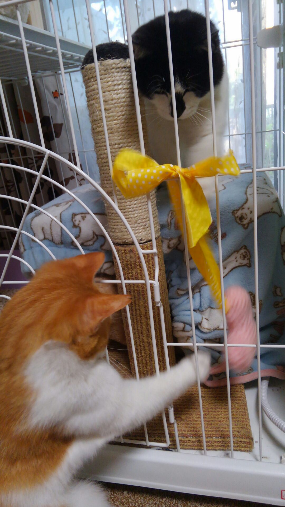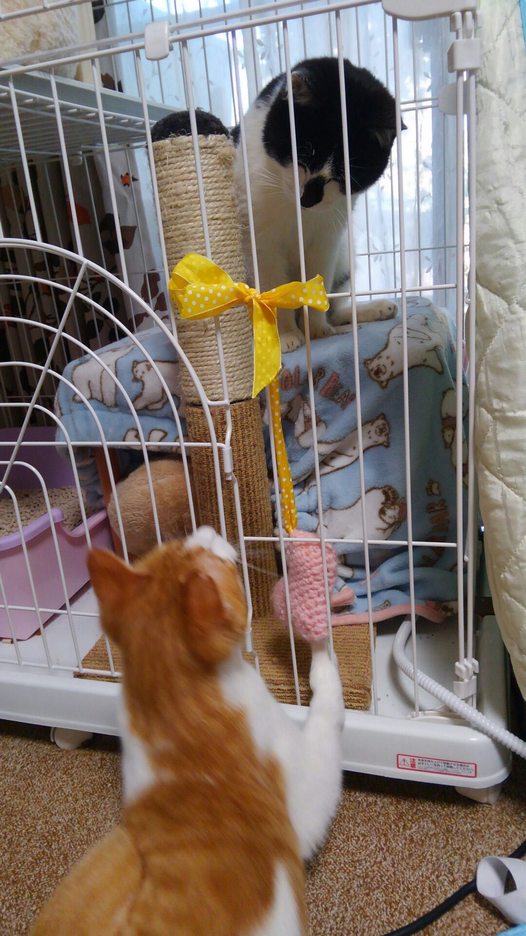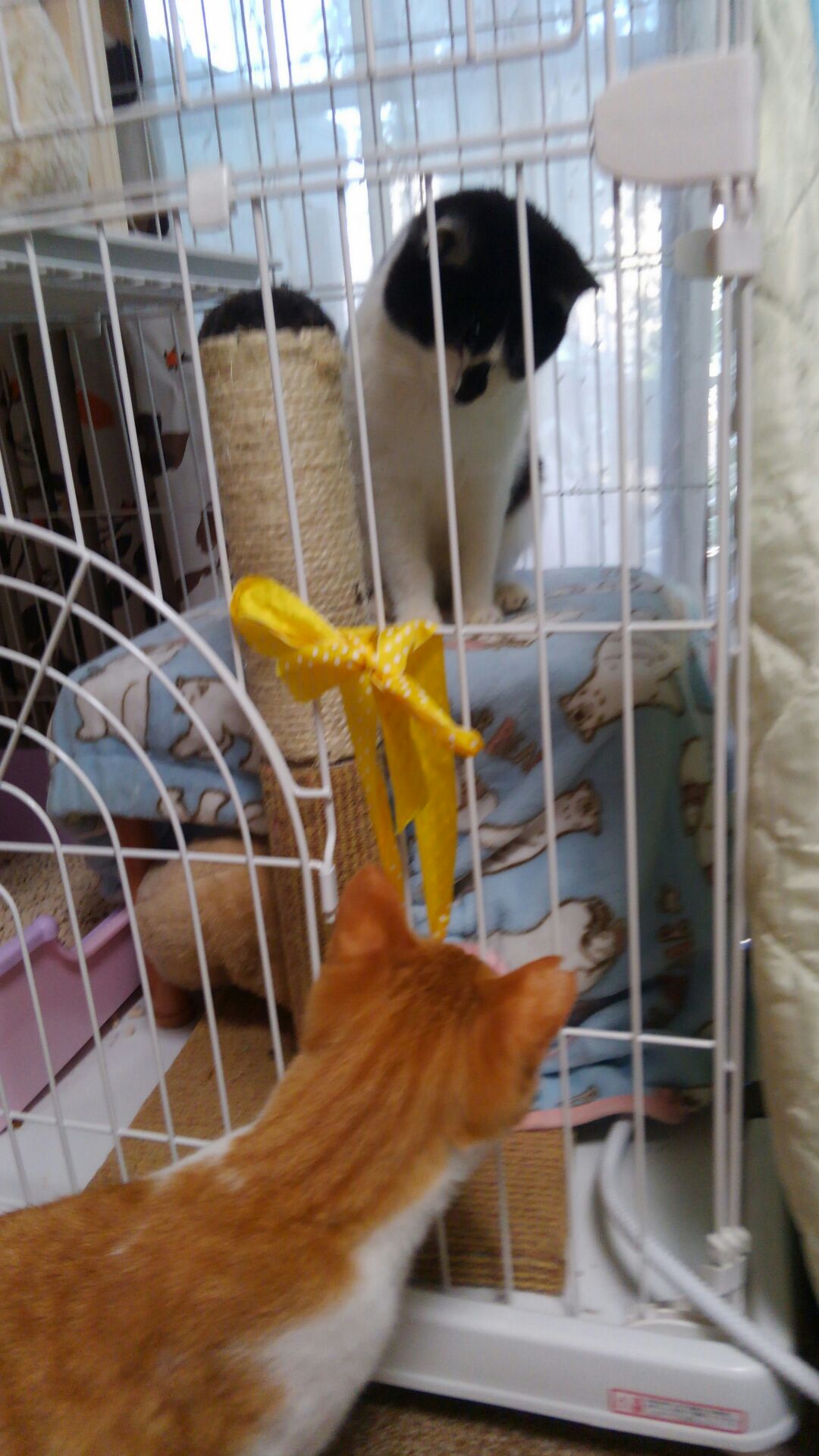 歳も近い若者同士。おっかなびっくりしながらも互いを意識してゲージ越しに一緒に遊んでいます。