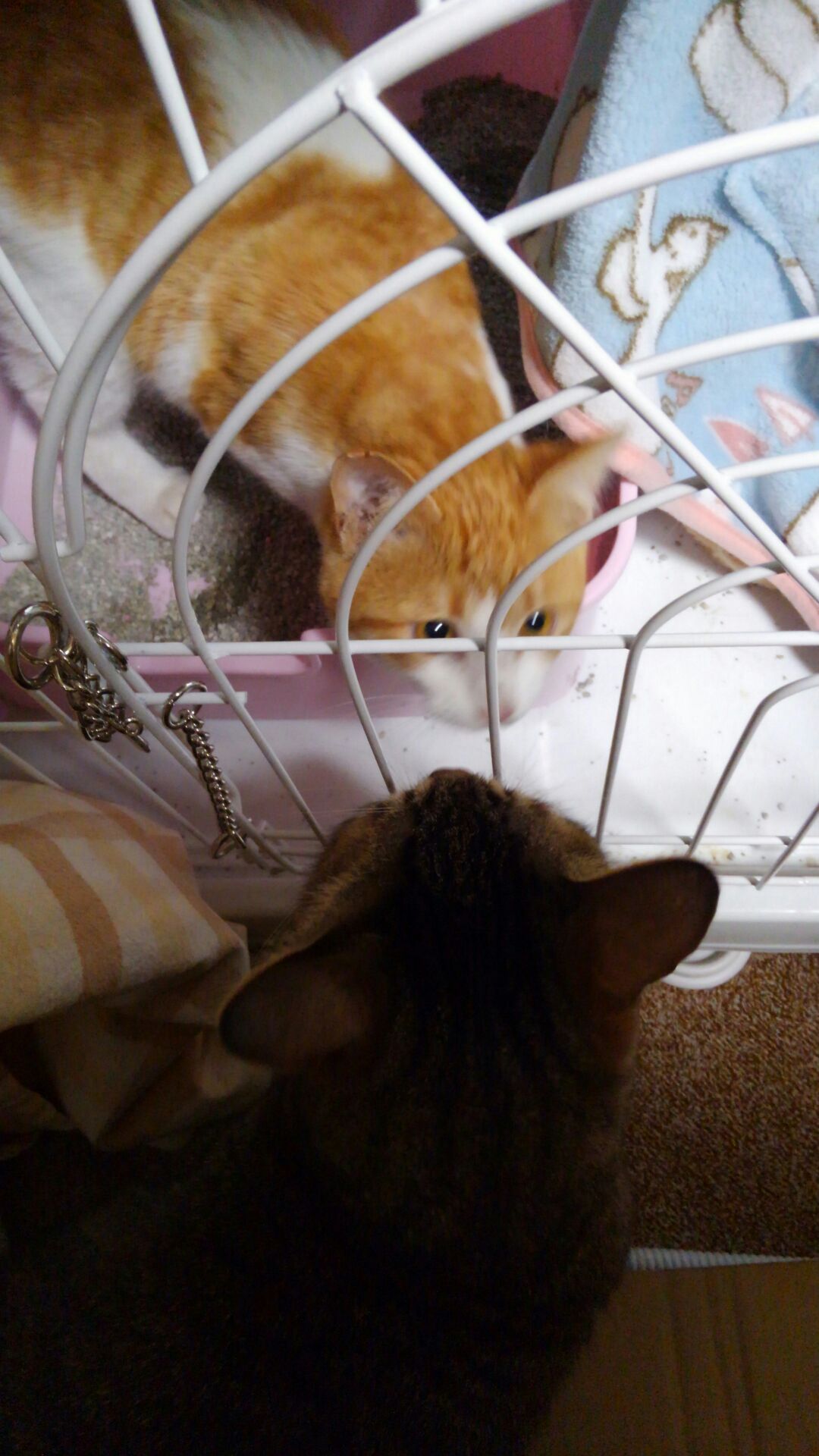 ゲージを覆っていた布を外して同室の四匹とさりげなく互いの存在をわかるようにしました。