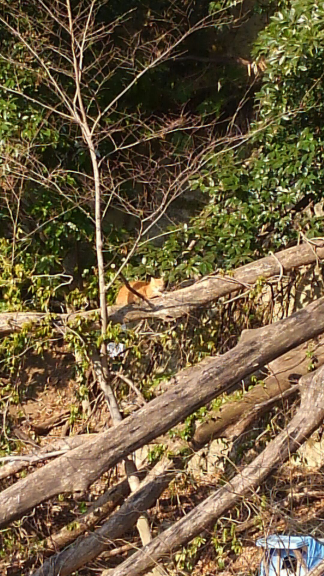 倒木の上で尻尾をちぎられた茶トラ君がいました。