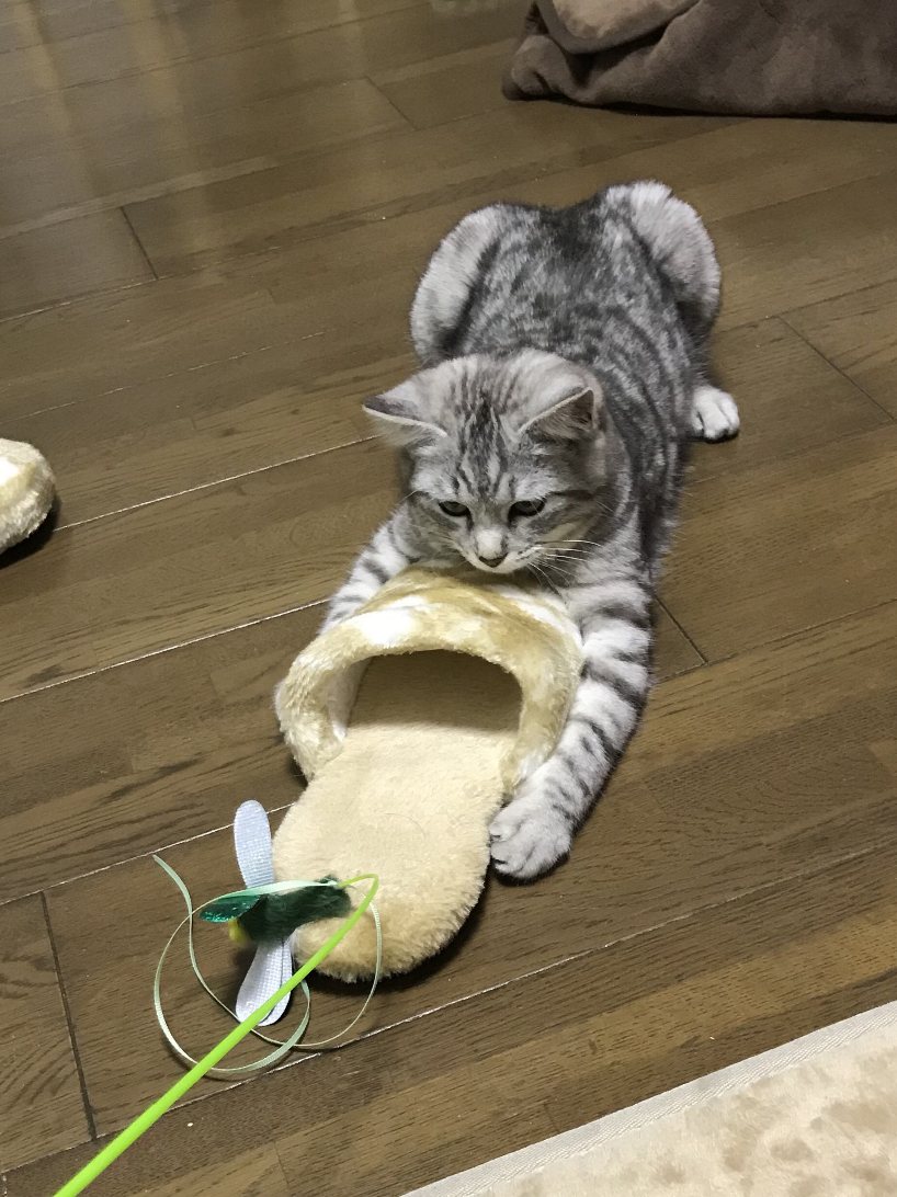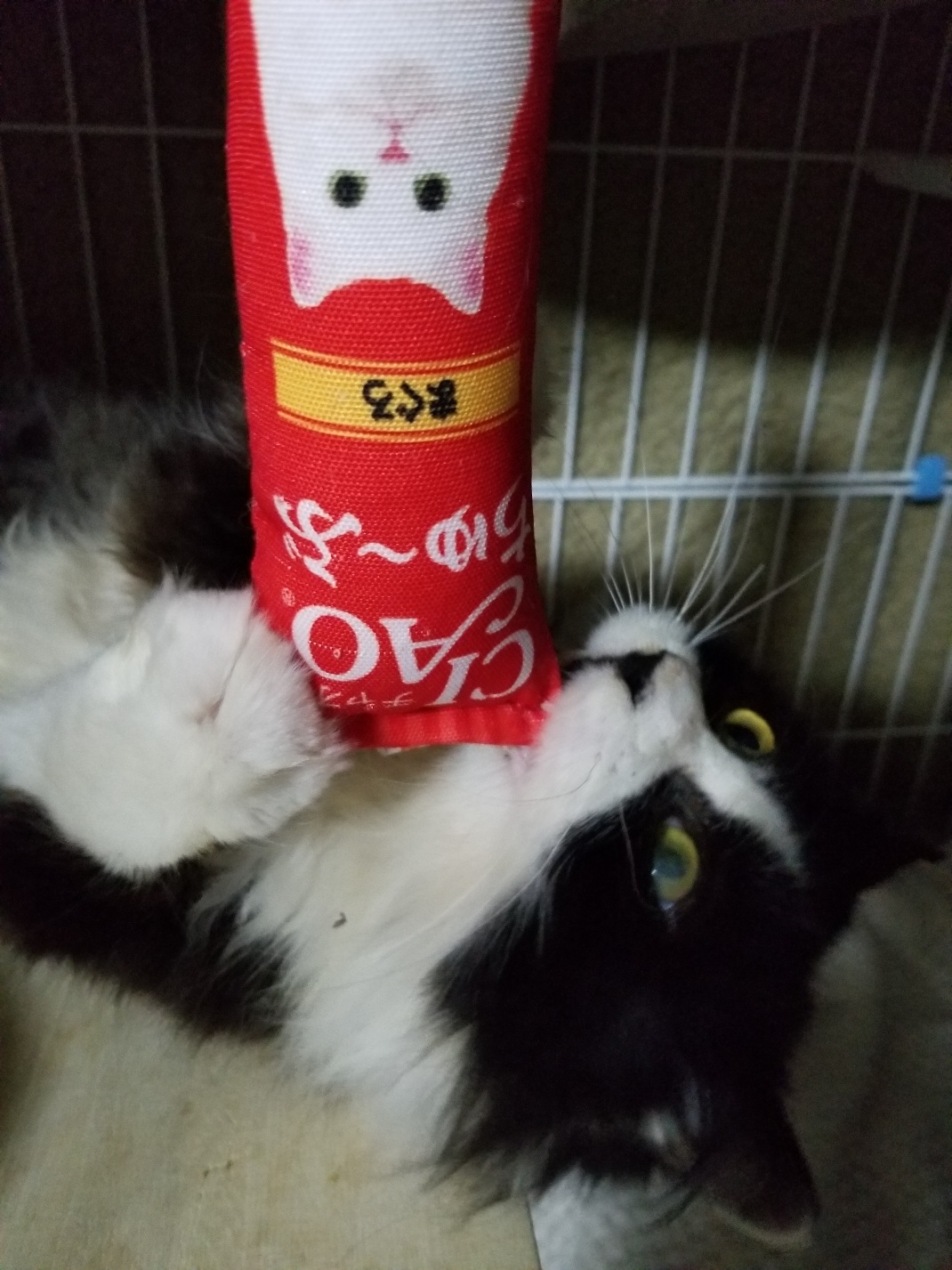 持って行ったチュールのおもちゃで遊んで、何だかすっかりリラックス。