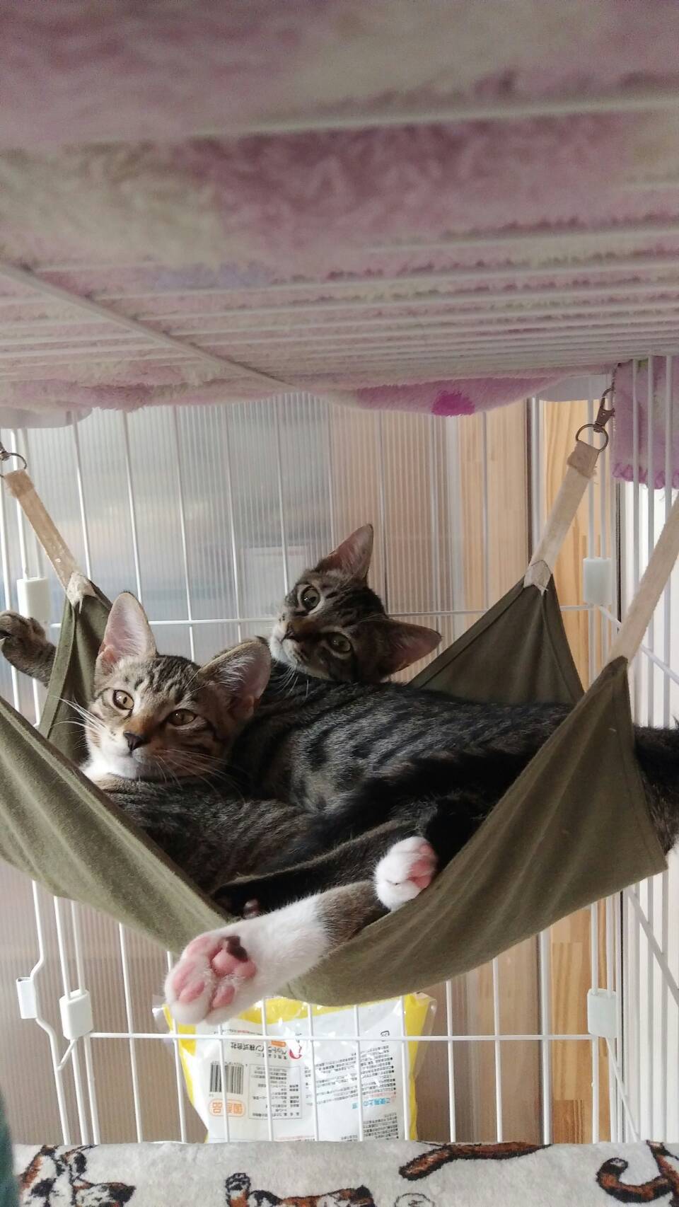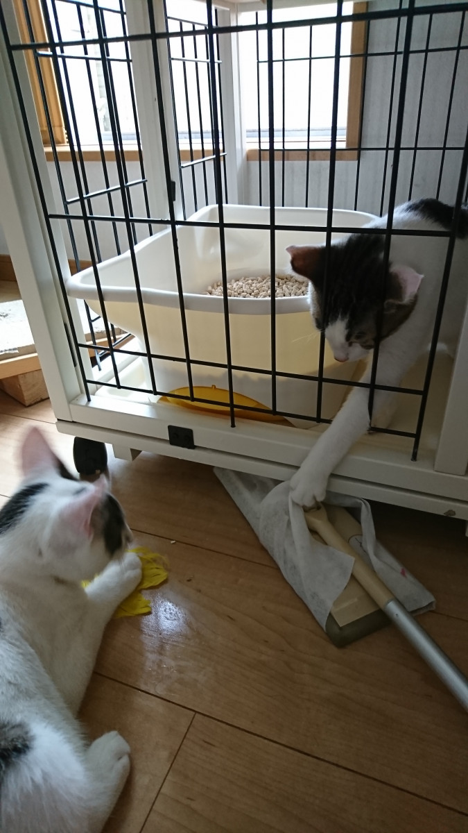 遊んで転げて、先住さんたちのおもちゃやベッド、縄張り場でも侵入してしまっているそうです。