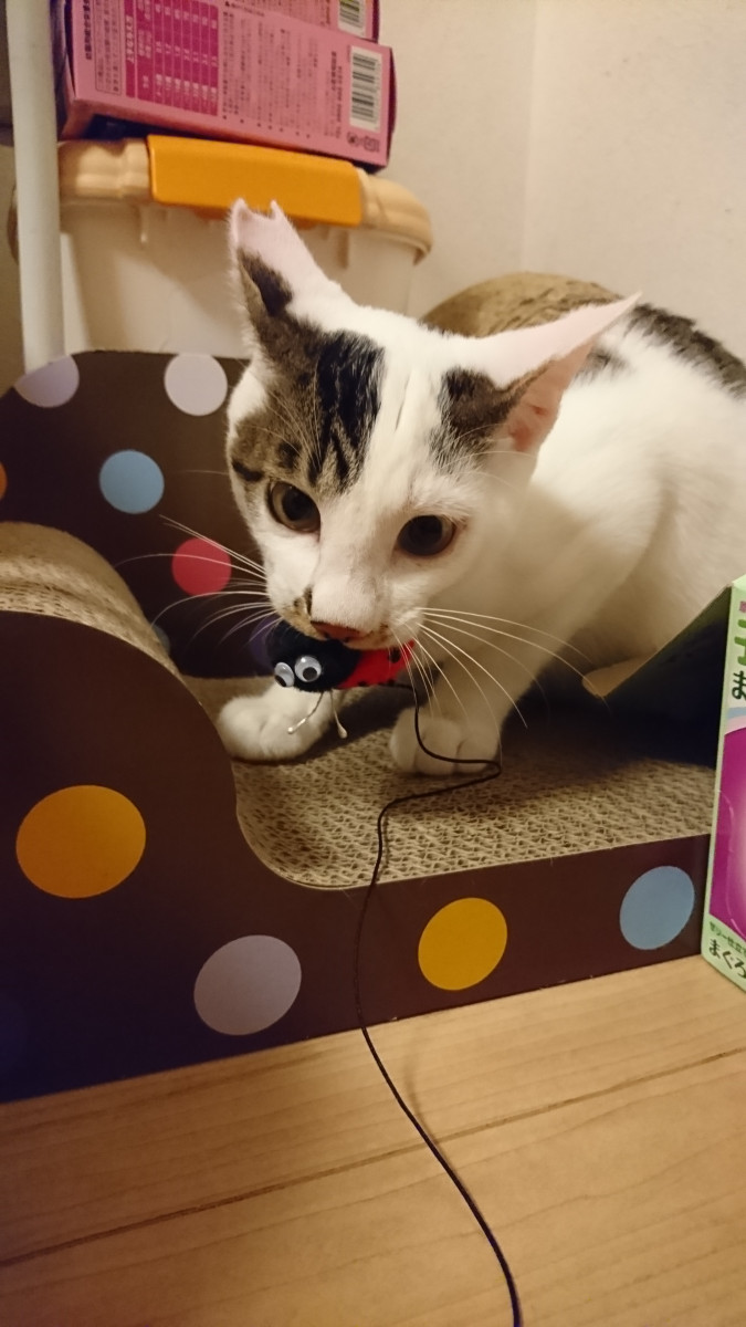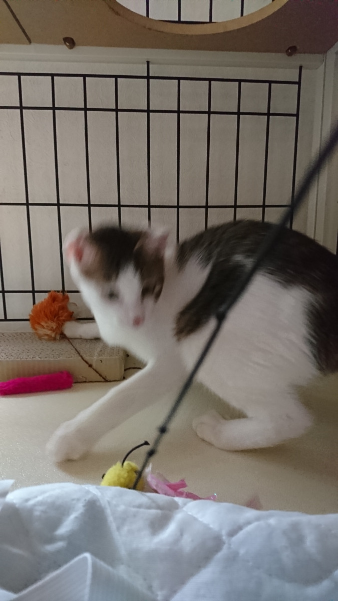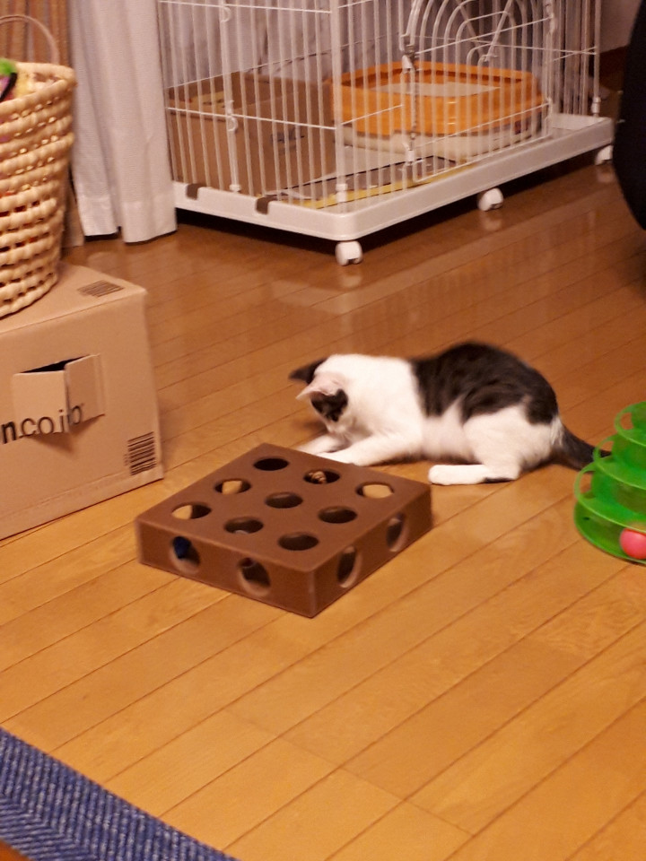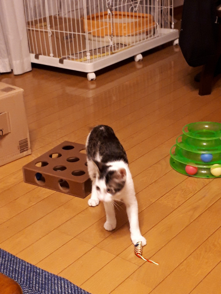 先週日曜にトライアルに行ったきゅうくんは予想に反して今ではしっかりご飯を食べて、ネズミのおもちゃで遊ぶ余裕も出ているそうです。