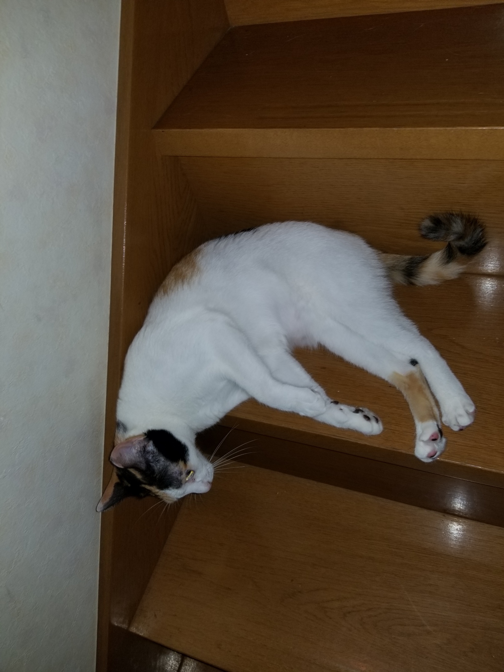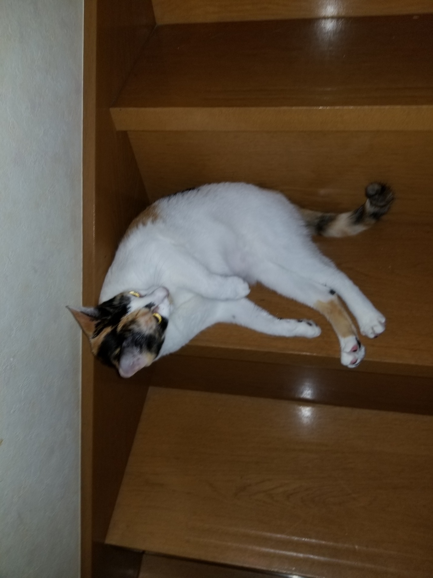 さつきは階段を先回りして登って行って、コロンとお腹を出し「私を先に撫でてって!」と主張します。