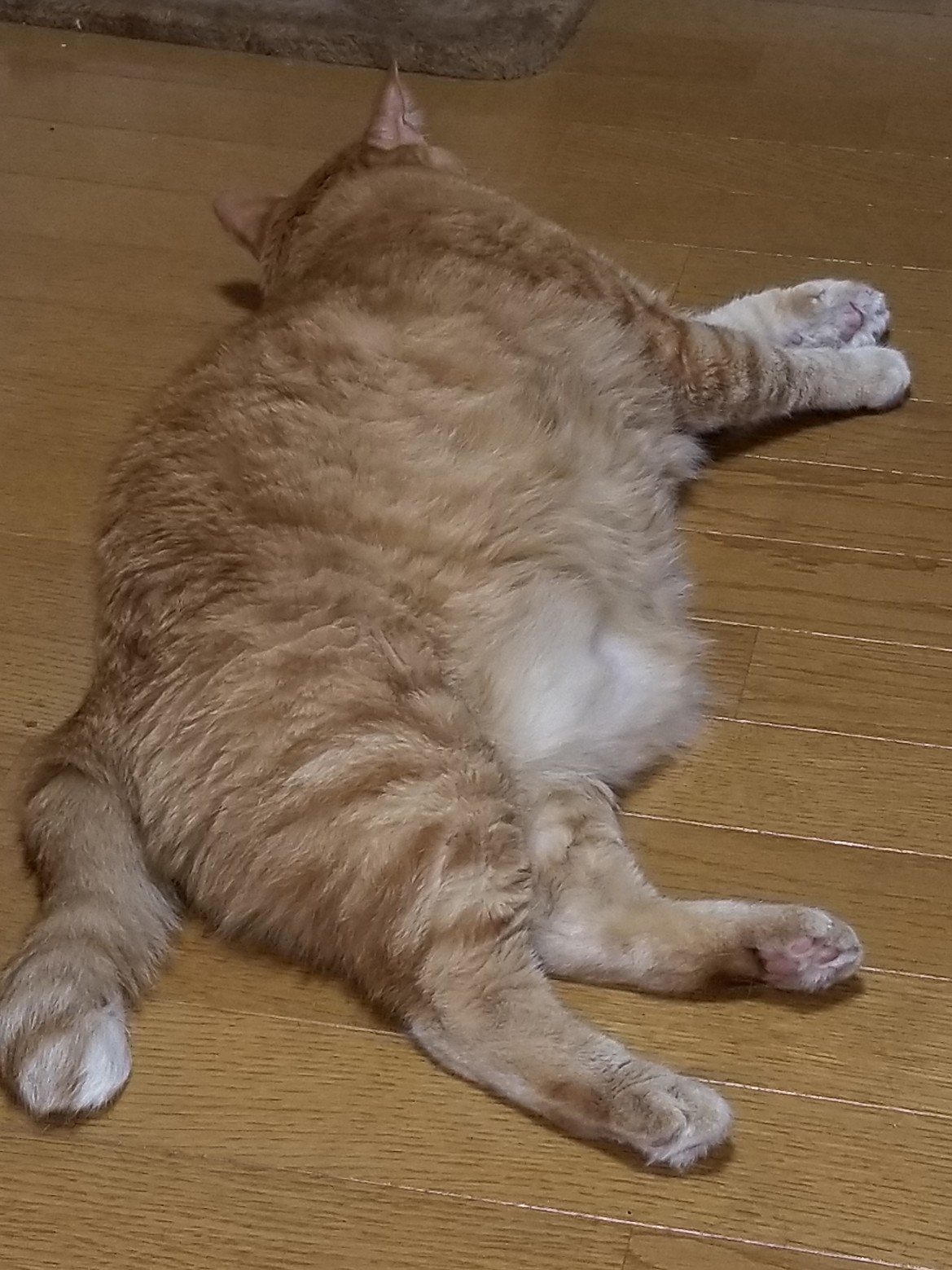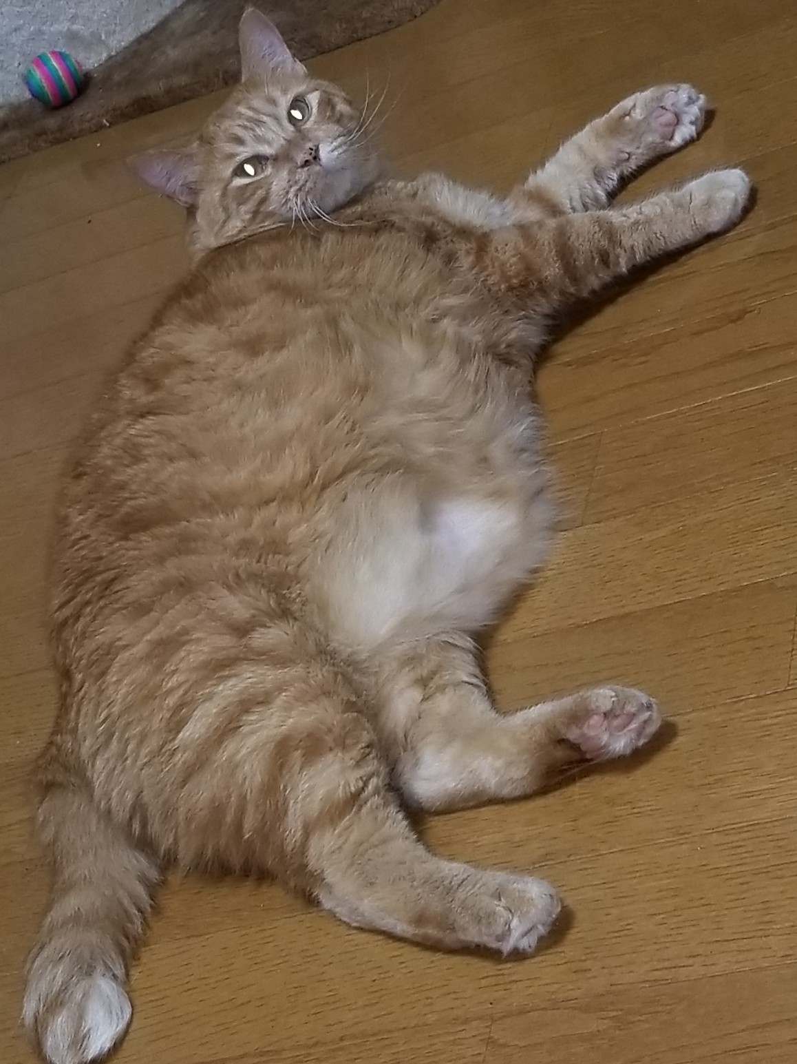 ワンちゃんみたいに高いところが嫌いで(お腹が邪魔で怖いから?)ぺた~っと暮らしています。