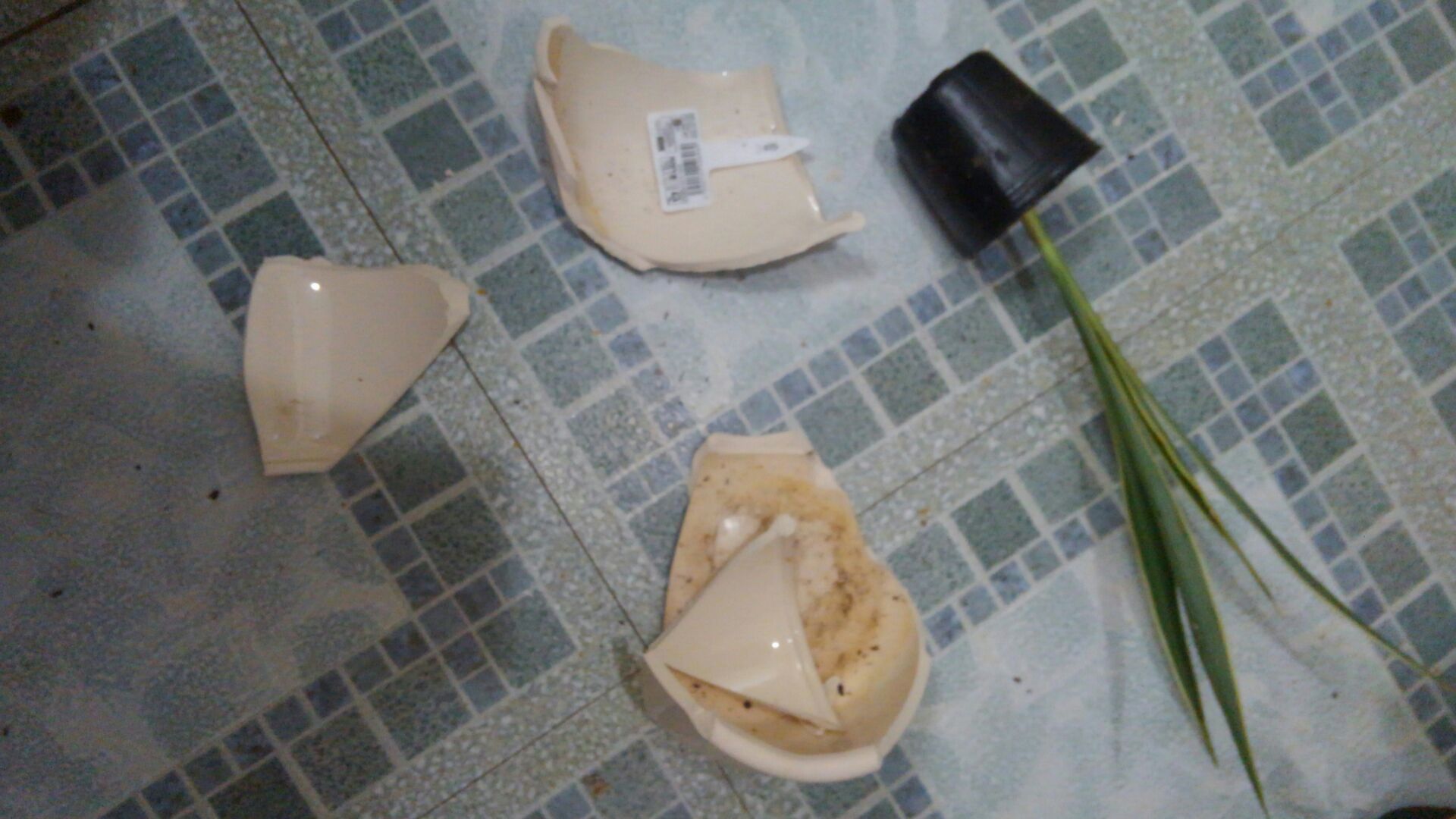 葉先の長いミニ観葉が落とされ鉢カバーは割れています。