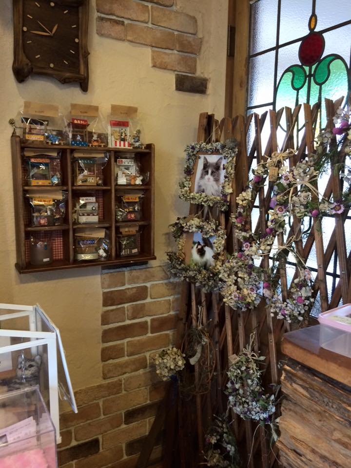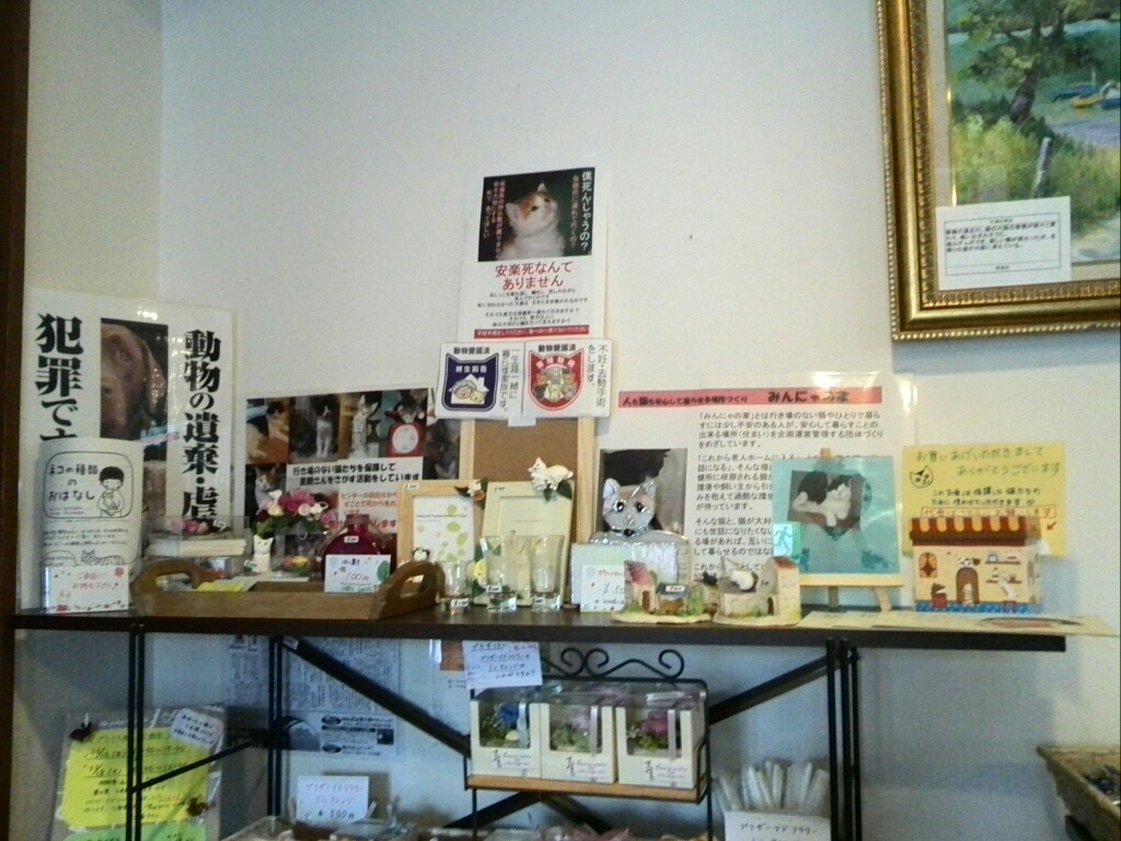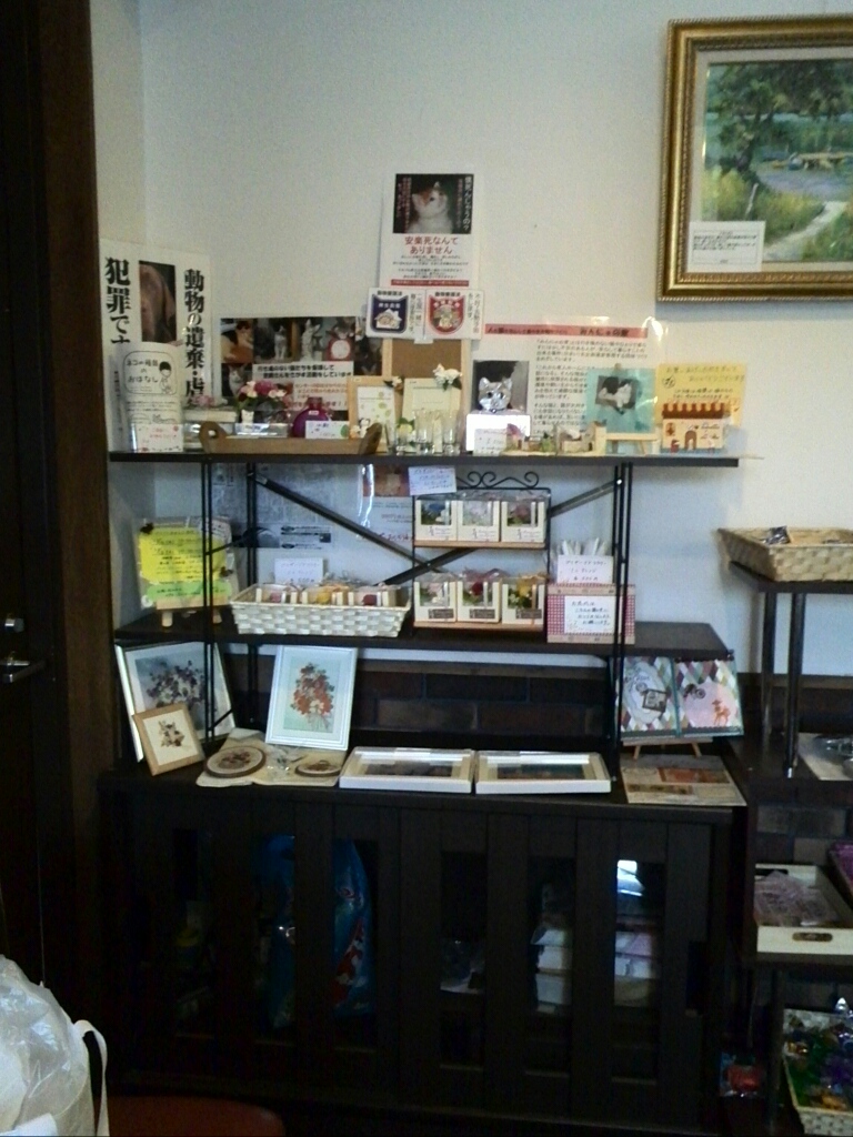 近くのレストラン「栗の里」二本松の店長さんのご好意で、店内の一部に猫の保護活動の資金集めとなる手作り品の販売や活動の紹介ができるコーナーができました。