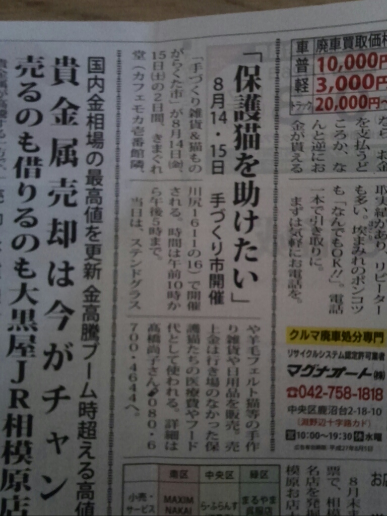 8月14、15日にきまぐれ堂さんで開催される「手作り雑貨&猫ものがらくた市」の記事がなんとタウンニュースにて紹介していただきました!! やったー!!