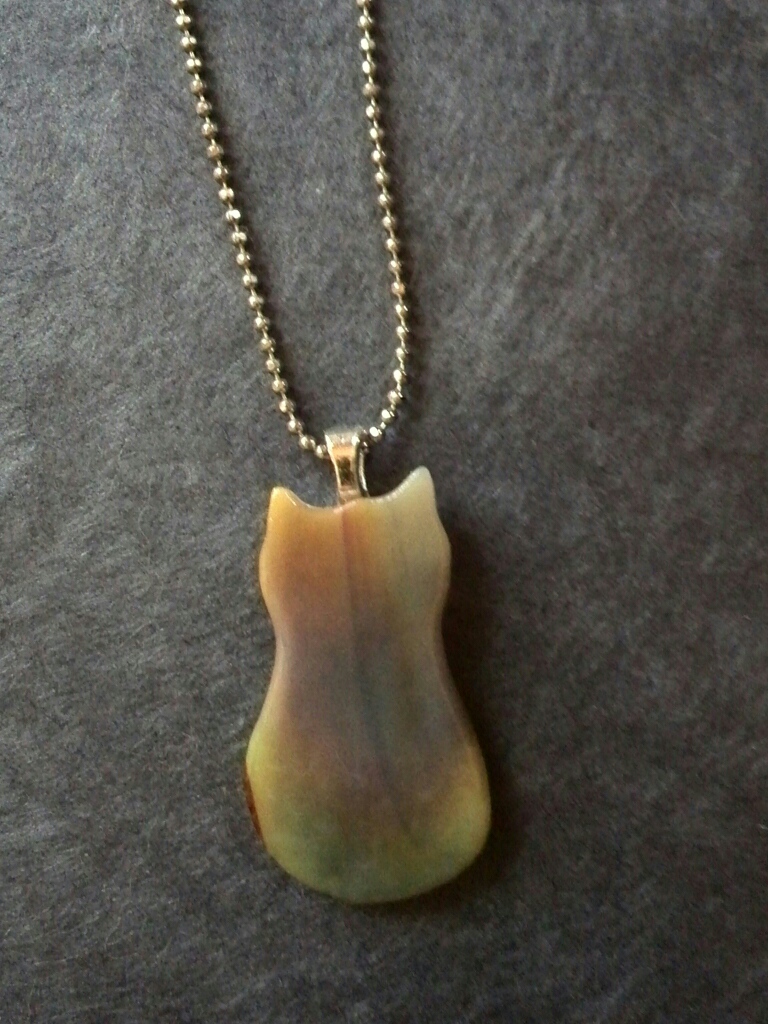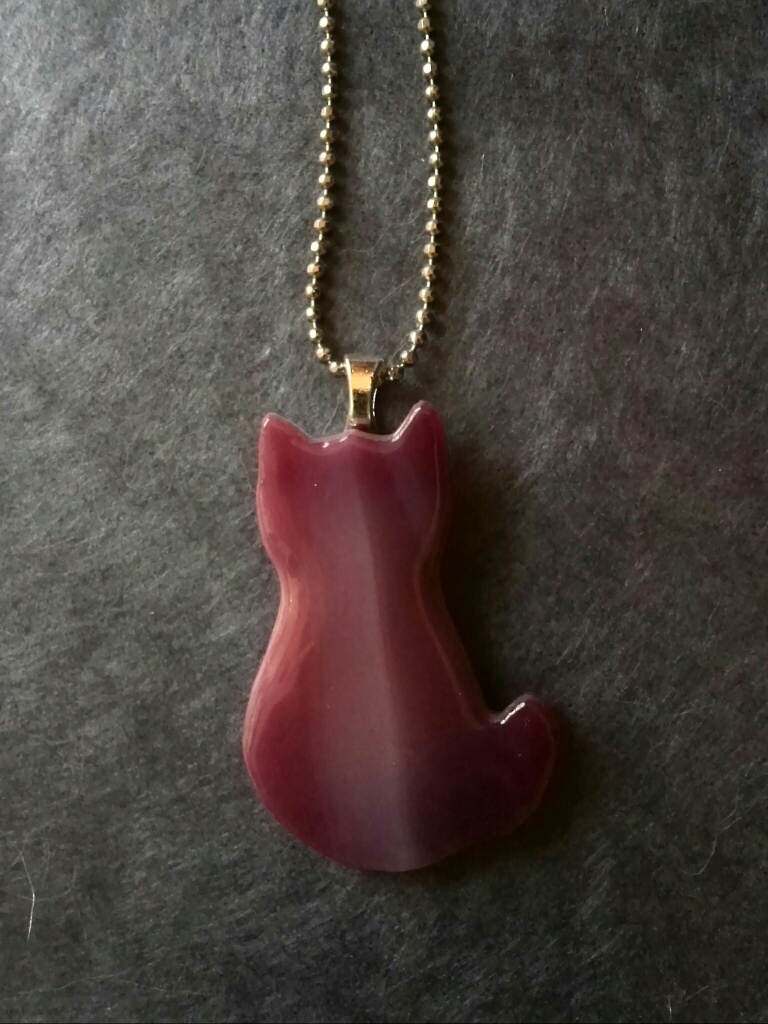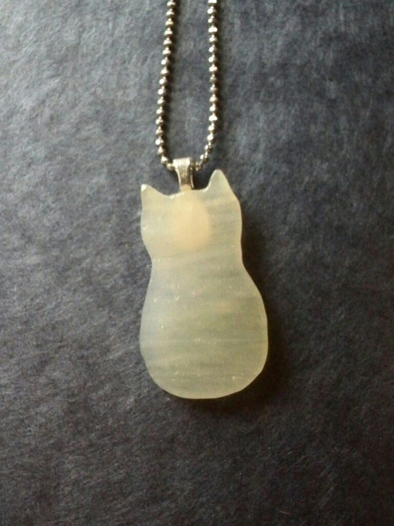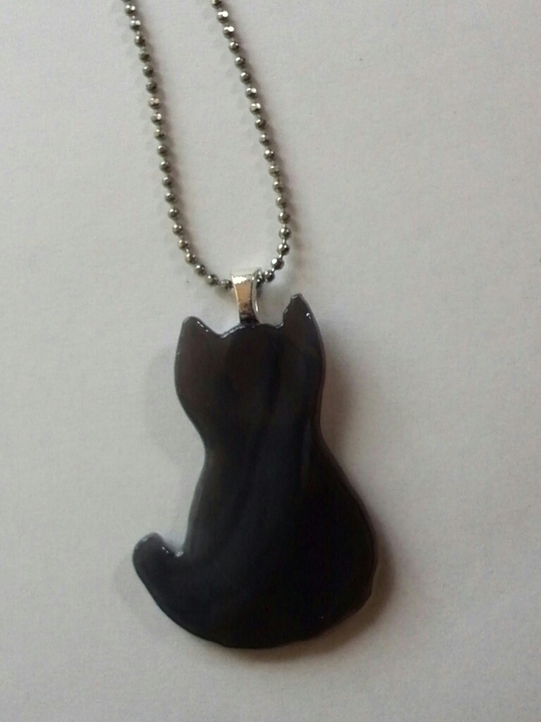 工房で猫型にカットしてフュージングしたものを持ち帰り、ネックレスのパーツを付けました。