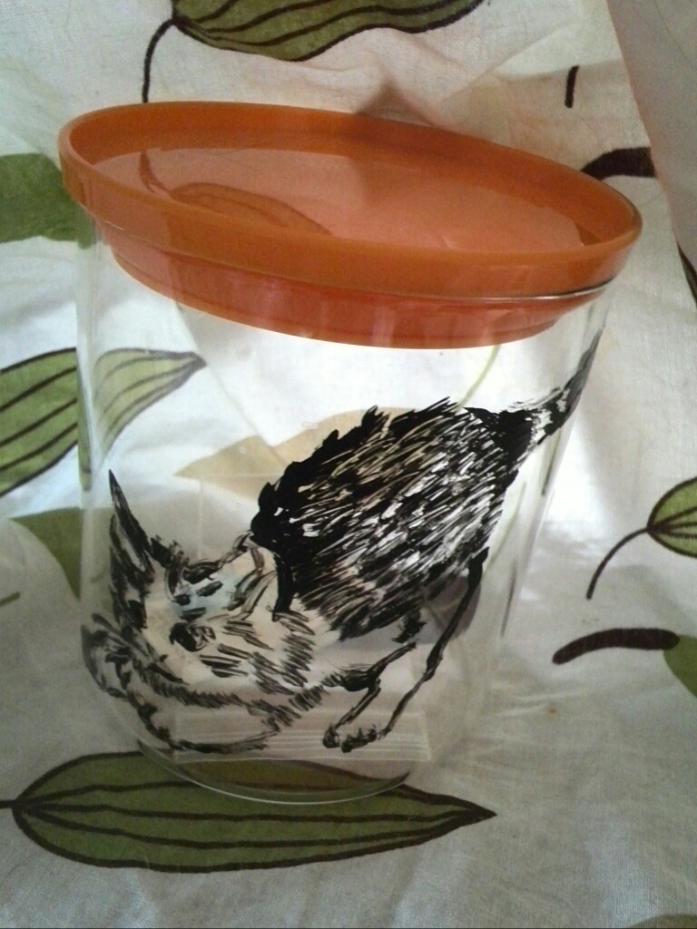 これはガラスのストック瓶にガラス用の絵の具で描いたんですが今一です (ノД`)・゜・。