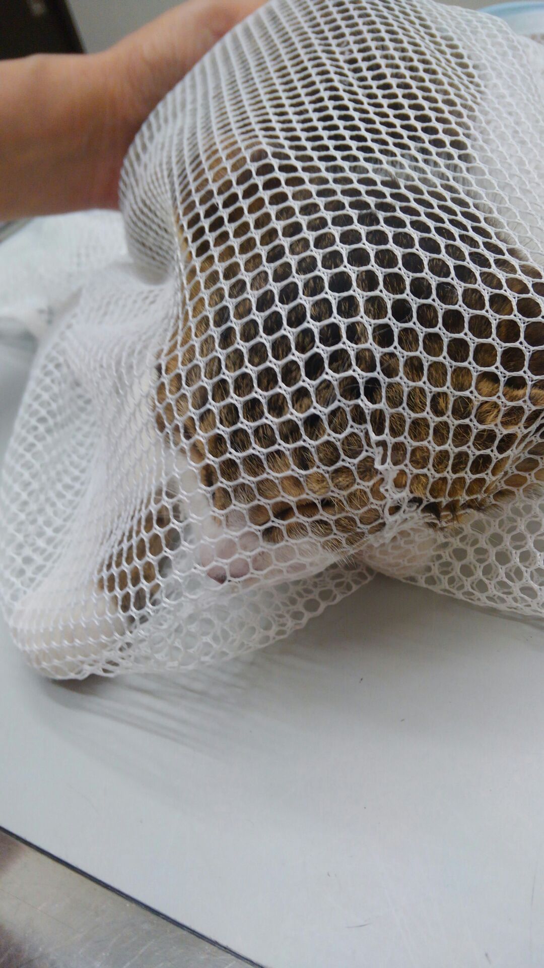 一人づつ洗濯ネットに入れて診察。