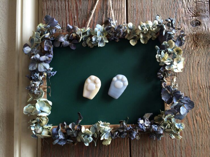 アジサイのドライフラワーで作った磁石の付く黒板もあります。