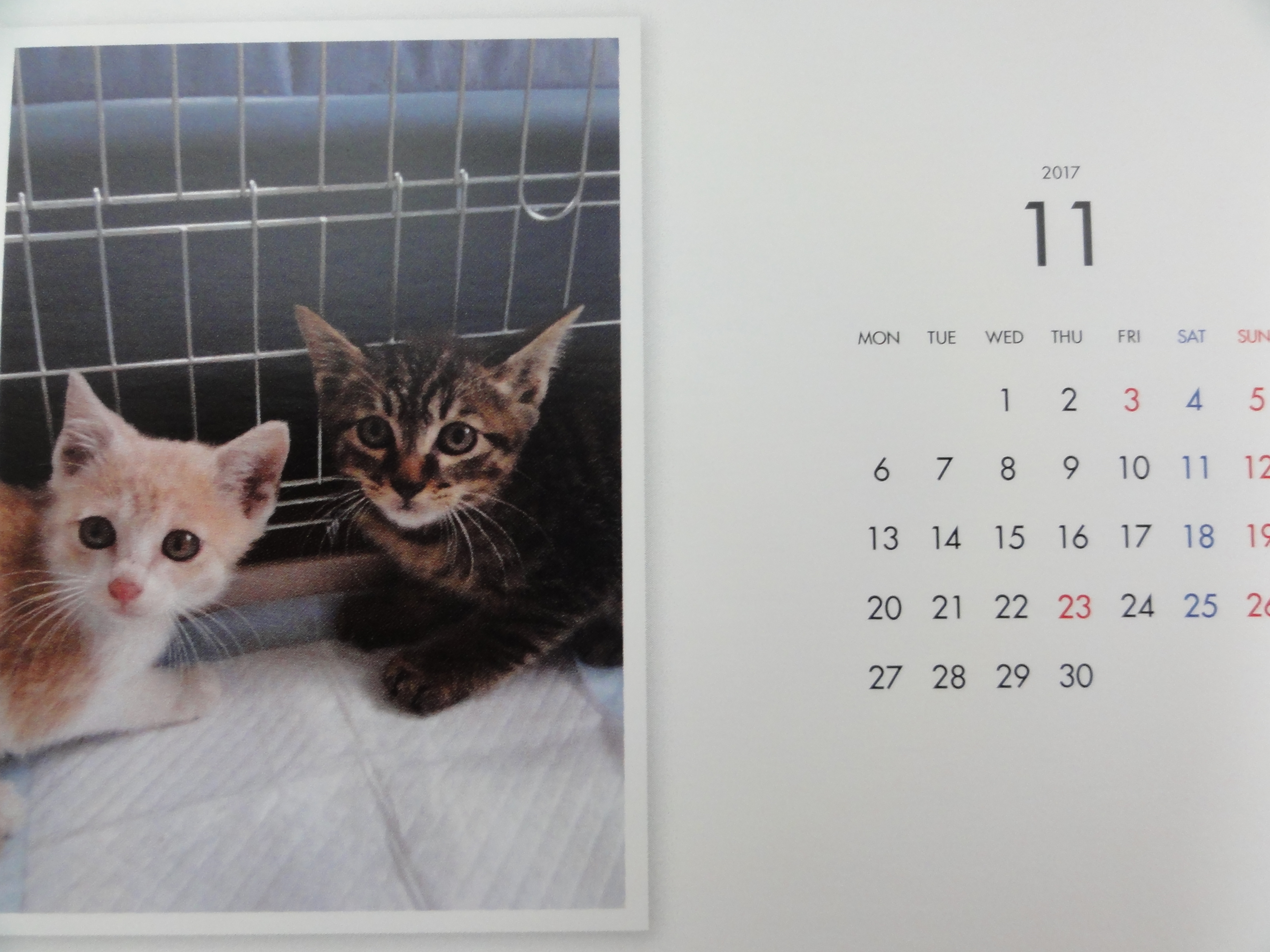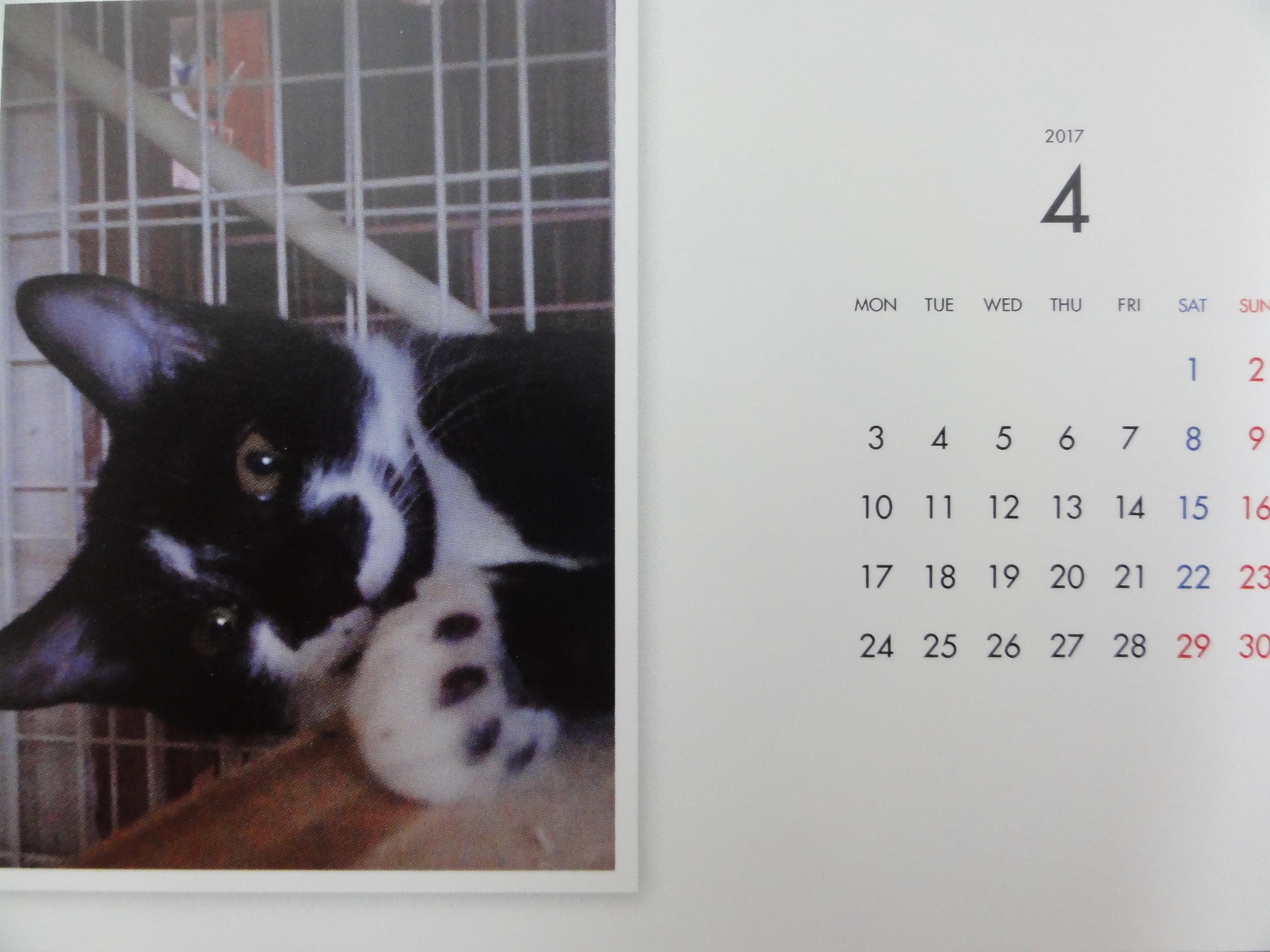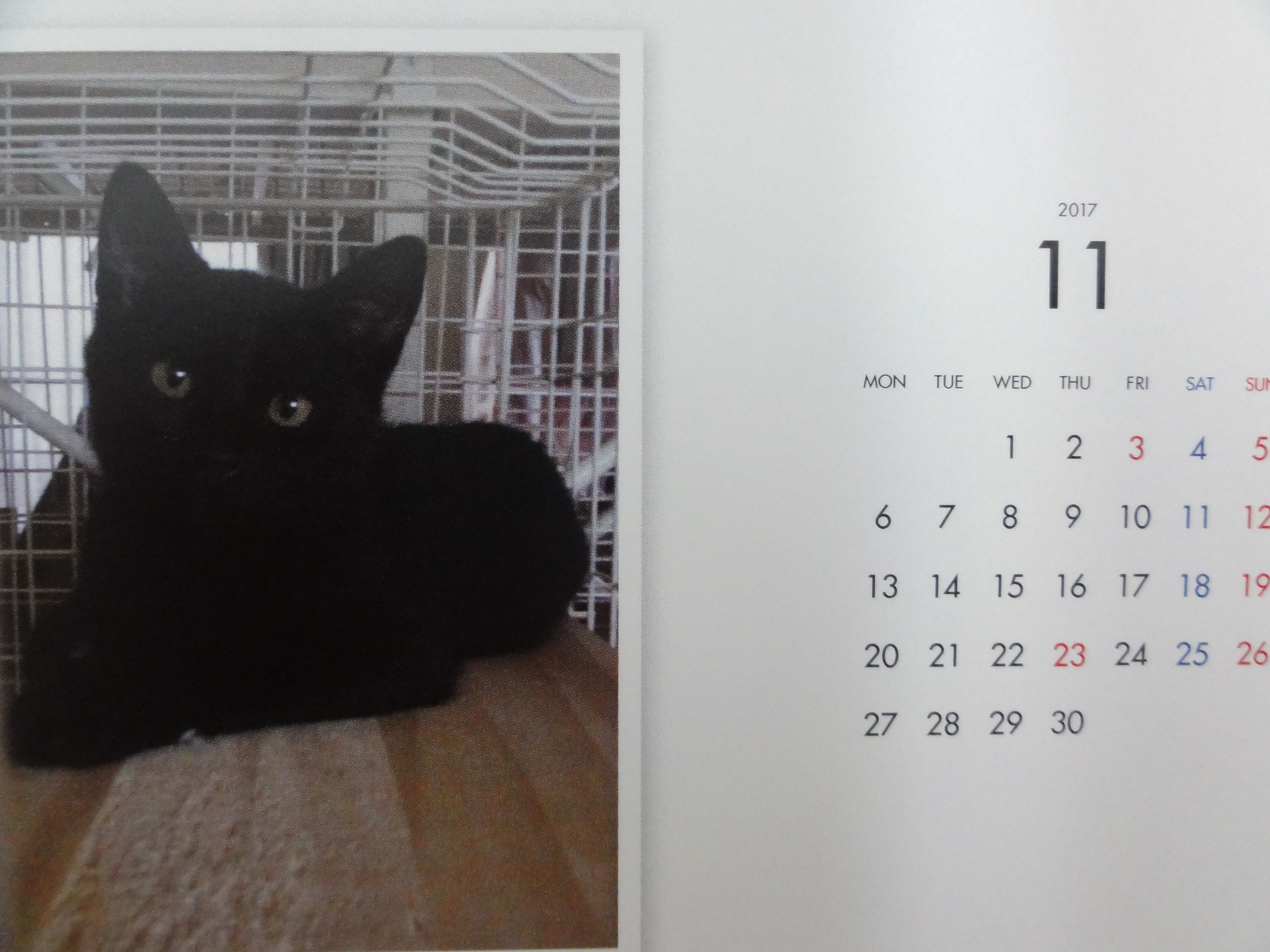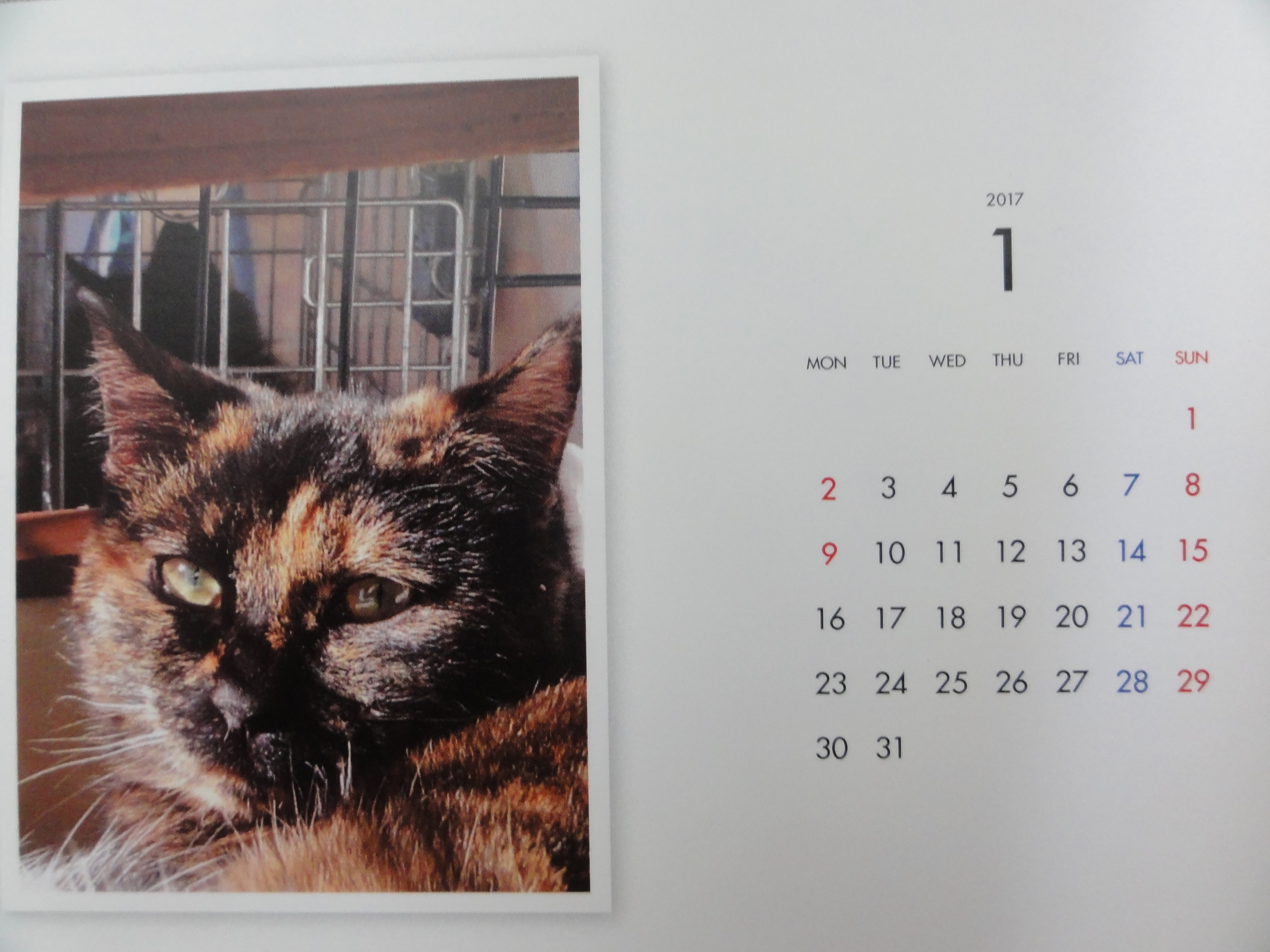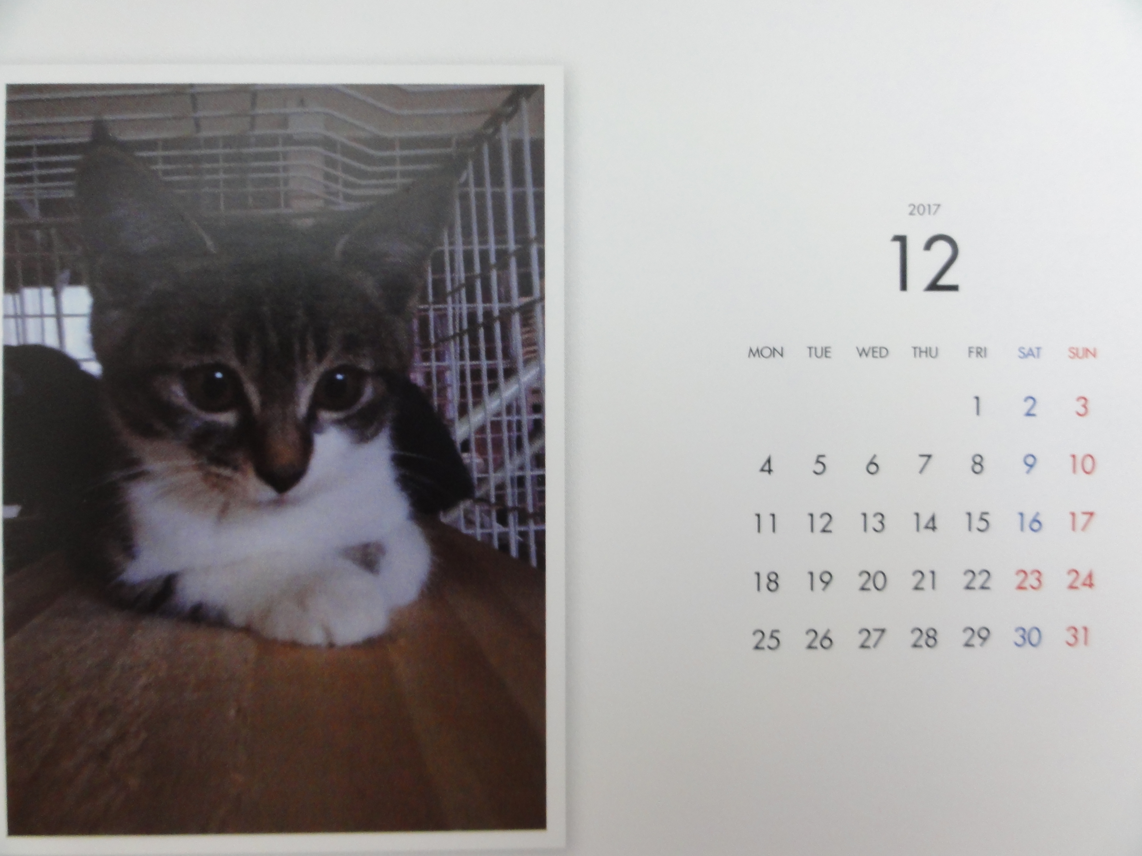 昨年からはじめた年末恒例のカレンダーの販売ですが、里子に行った子、里親様を募集中の子を毎月一枚掲載した卓上のコンパクトなカレンダーです。