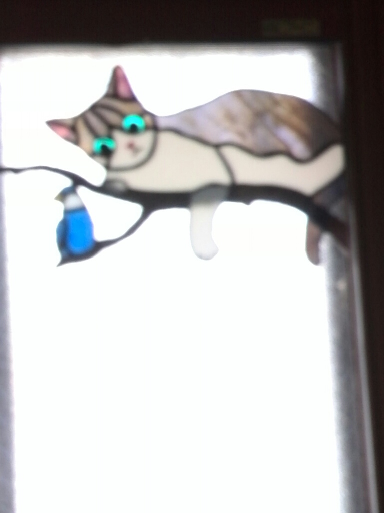 玄関の欄間には6匹の犬猫のステンドパネルがあります。