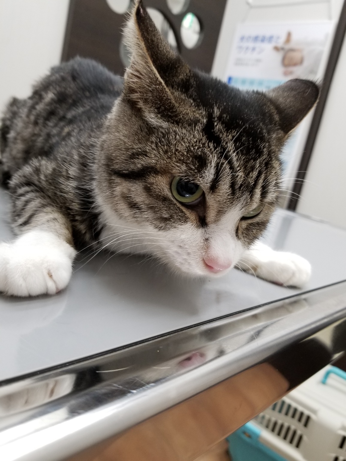 ワクチン接種と子猫の時に折れて関節の先が成長していない手の様子を見ていただきました。