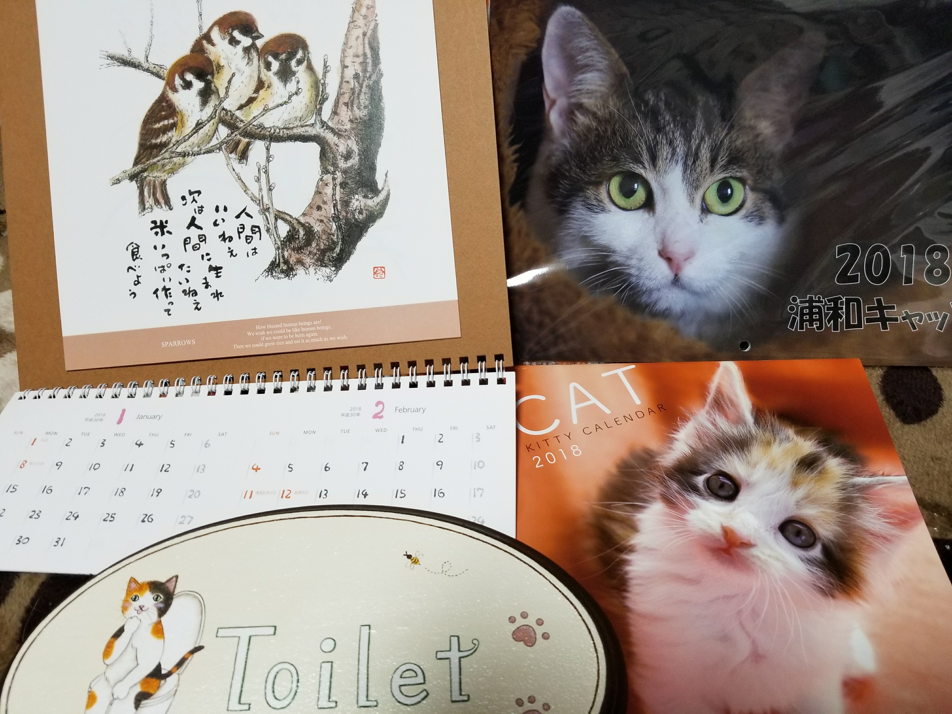 なるちゃん似のにゃんこのドアプレートはきまぐれ堂様から、星野富弘さんのカレンダーは預かりでお世話になったS様から、浦和キャッツさんのカレンダーはコリンアレン茶々ママ様から、いただきました。