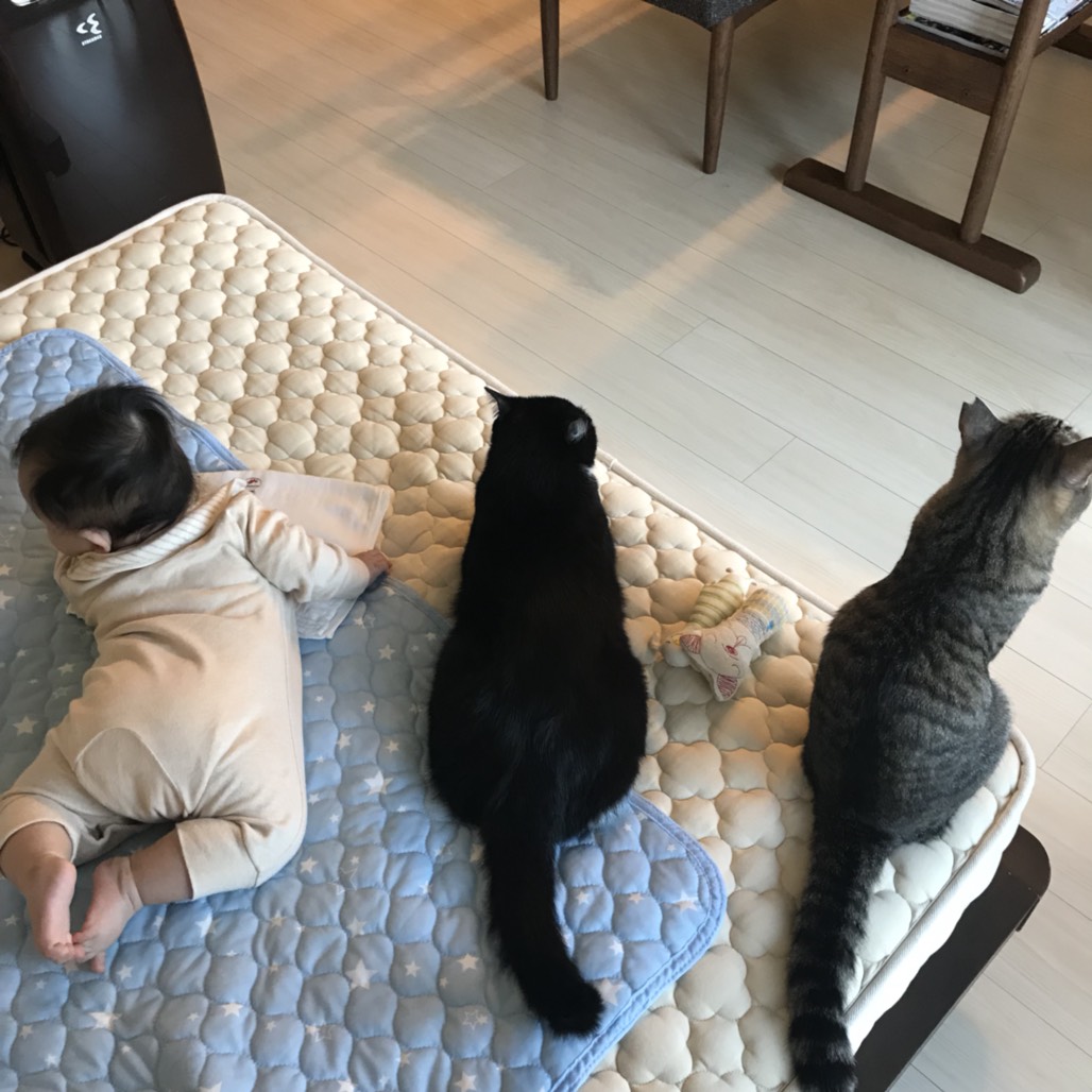 赤ちゃんが生まれて猫たちは最初は赤ちゃんの存在に驚き気を使いながらも、いつの間にか当たり前になって、赤ちゃんも猫も互いを受け入れ暮らしているのが素晴らしくってうれしいです!!