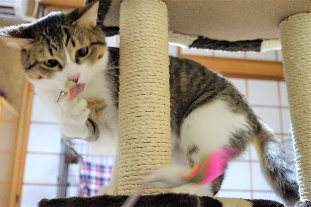 片側の柱には植木で使う麻?シュロ?の幅広のものをグルグル巻いて爪とぎも存分にできる設計です。
