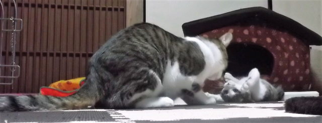 みゅうみゅう鳴くみのる君の声に反応して鳴き返すこてつくん。