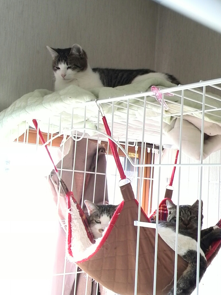 保護してから1ヶ月、4匹を三段ゲージに入れていました。