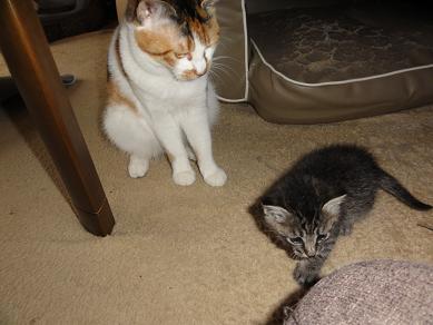 当然わが家の他の猫とは隔離ですが、1歳になったばかりのなるはおちびに興味津々。