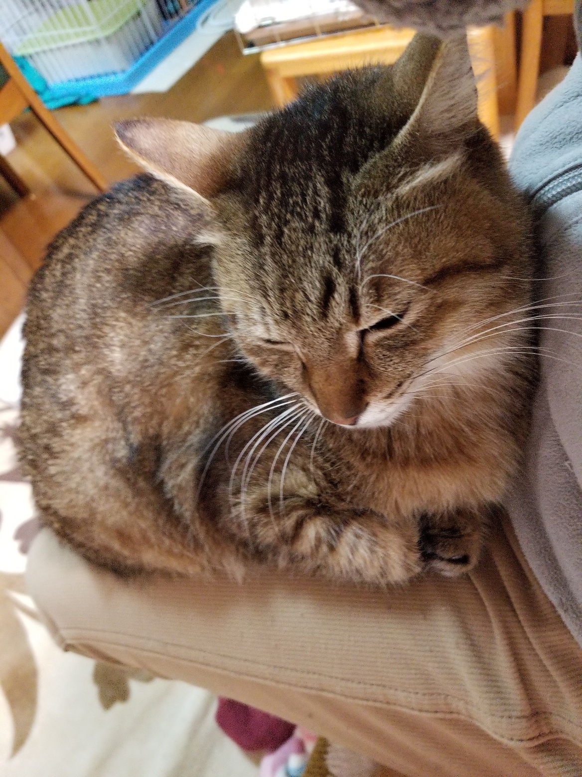 昨年9月にスーパーの駐車場で保護したものの、極度の猫嫌いから実家に預けている