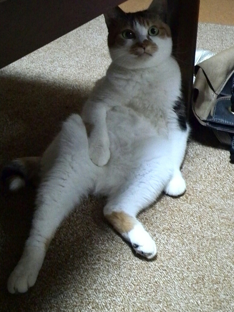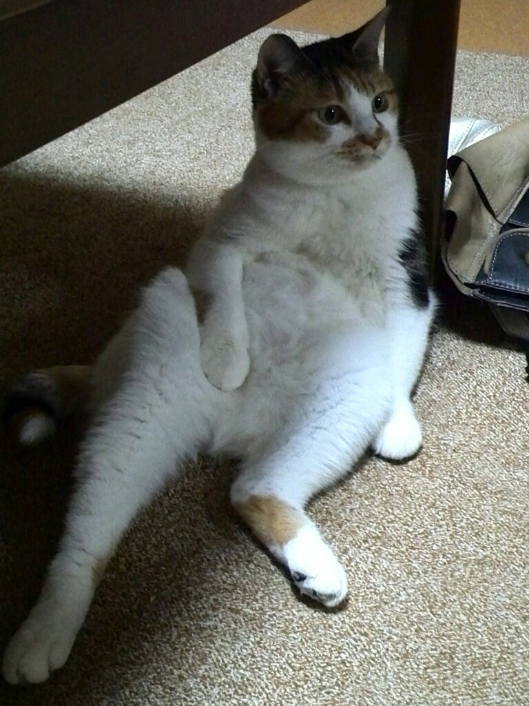 ふと猫たちを見るとなるちゃんがオジサン座りをしていました。