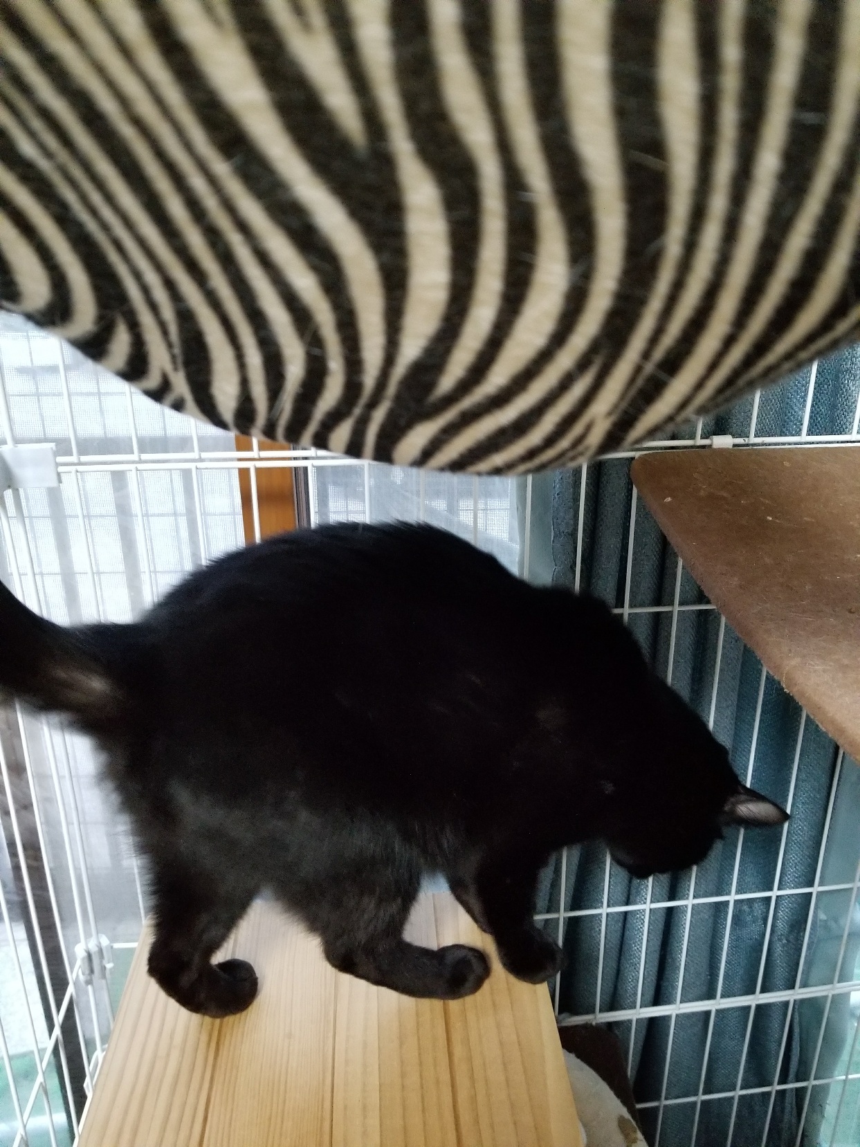 賢いクロちゃんは扉が開いているゲージの最上段でご飯を食べます。