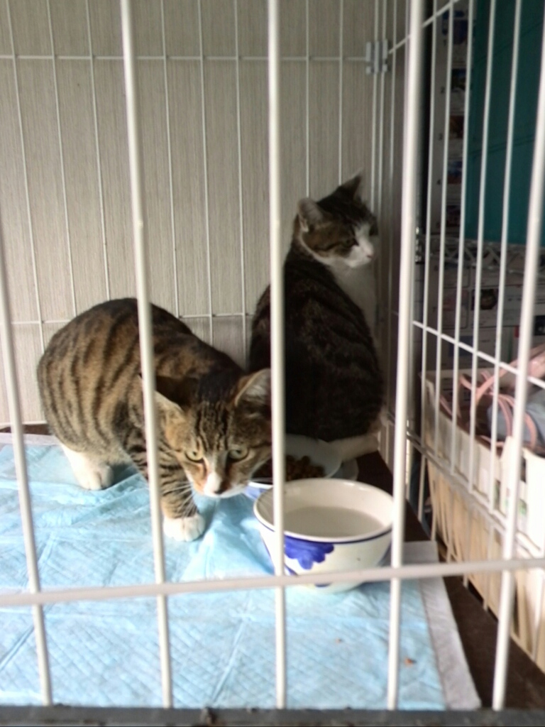 手術を終えて帰宅した男の子を三段ゲージに入れました。朝一足先に入っていた女の子とご対面。