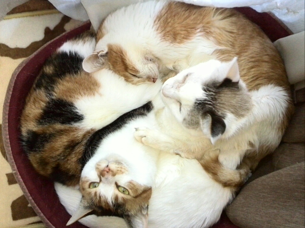 節約のため厚着して暖房を止めたためか、珍しく猫団子が出来ていました!