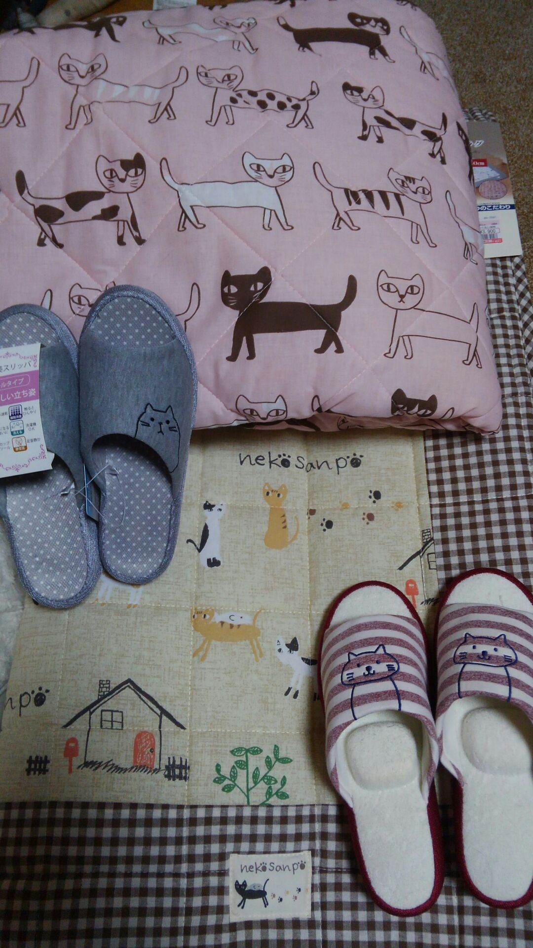 スリッパだけ買う予定が猫ものの敷物に、マルチカバー(なんと500円の処分品)も買ってしまいました。