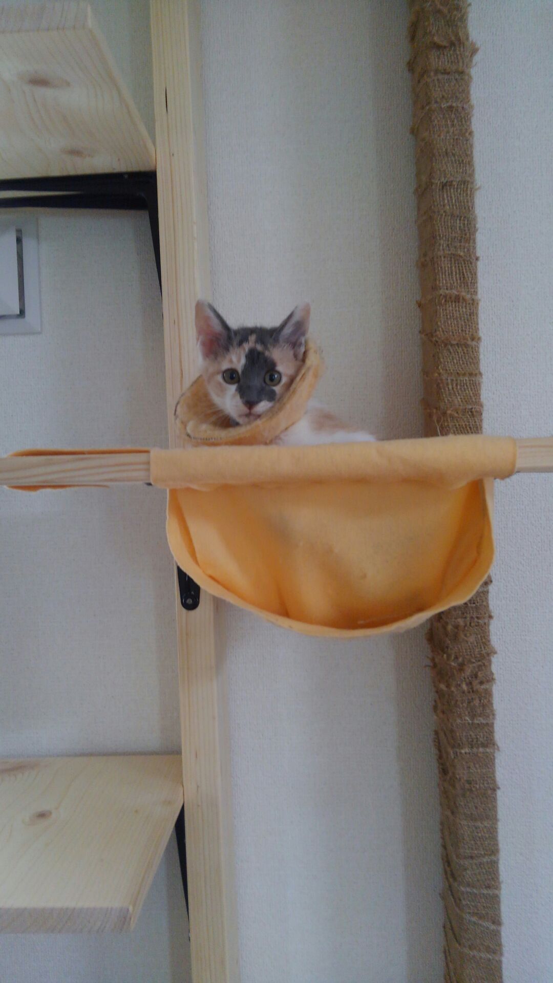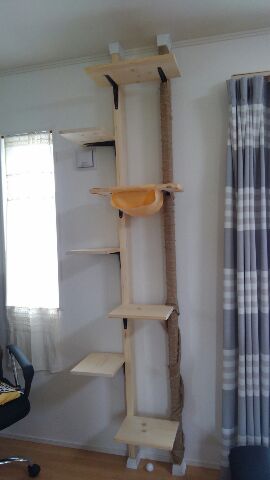 片側の柱には植木で使う麻?シュロ?の幅広のものをグルグル巻いて爪とぎも存分にできる設計です。