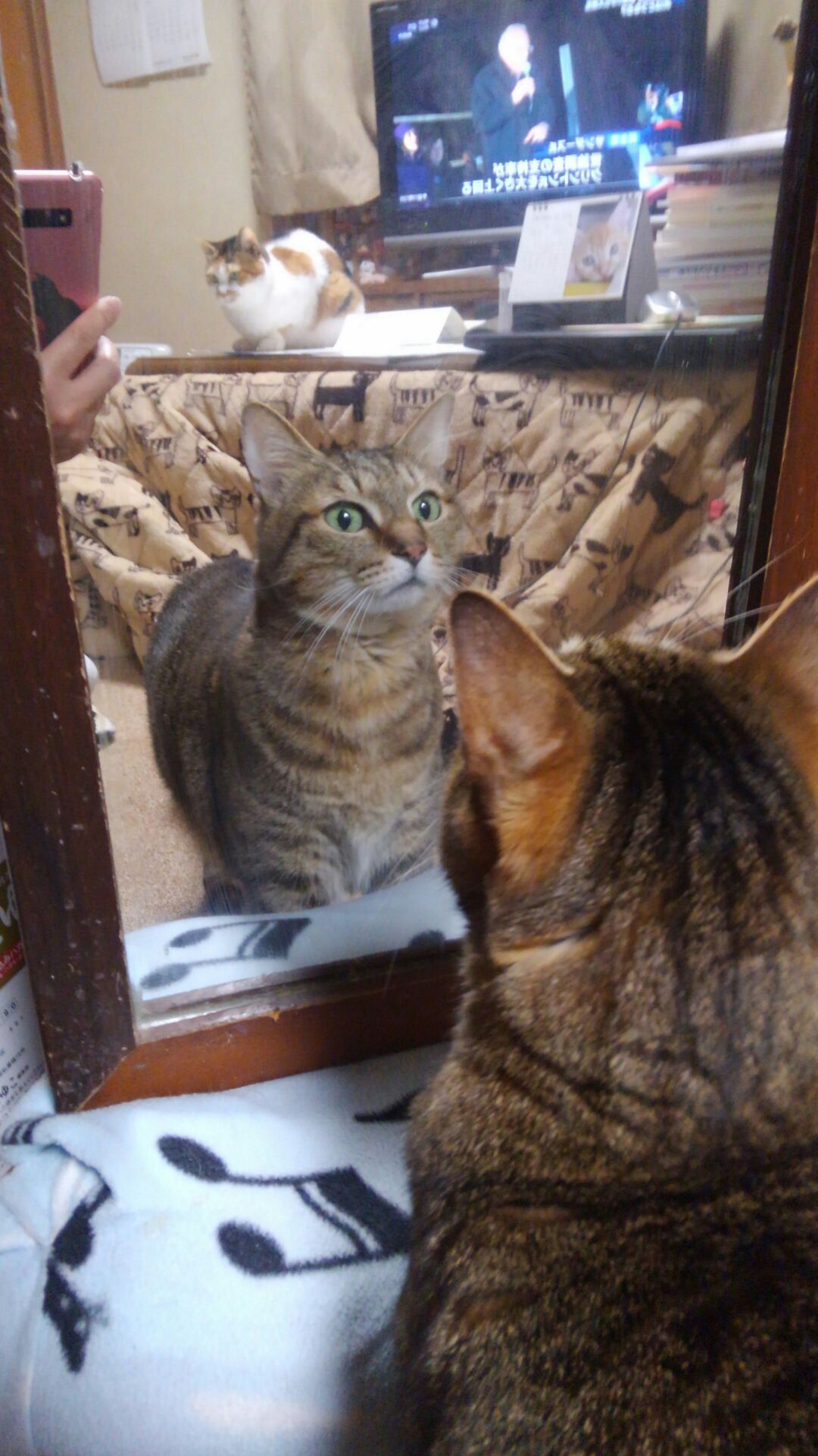 鏡を不思議そうに見ているごんちゃん。